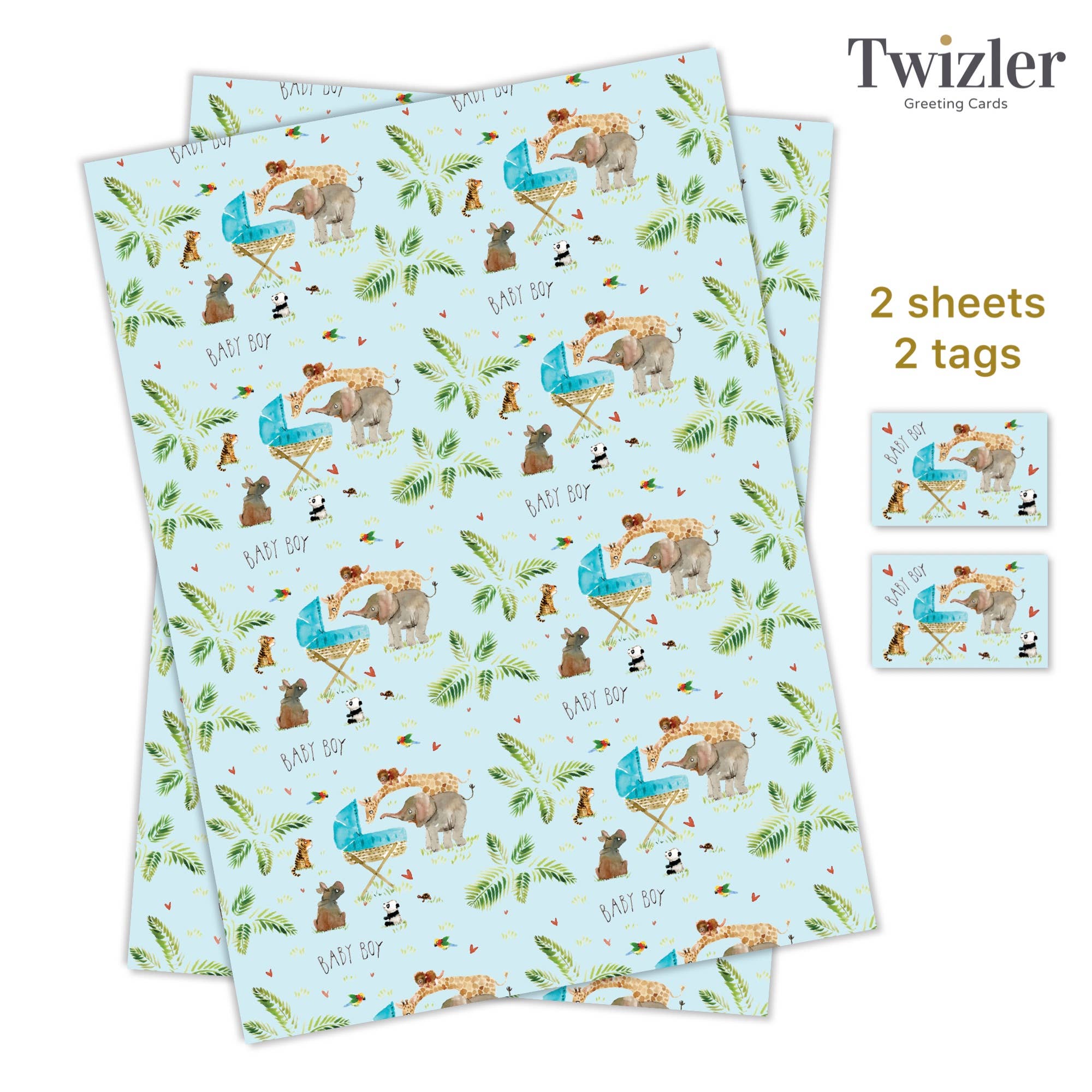 Our beautiful new baby wrapping paper for girls features a new jungle addition! The jungle animals are looking on fondly over a pink crib. By default this wrap will come packed in a cello - 2 sheets and 2 tags. If you would prefer flat wrap please message us - we can also offer this wrap flat in sheets of 25, 62p per sheet. Our wrap is available as just a minimum of 2 packs per design so you can easily add on to your card order.