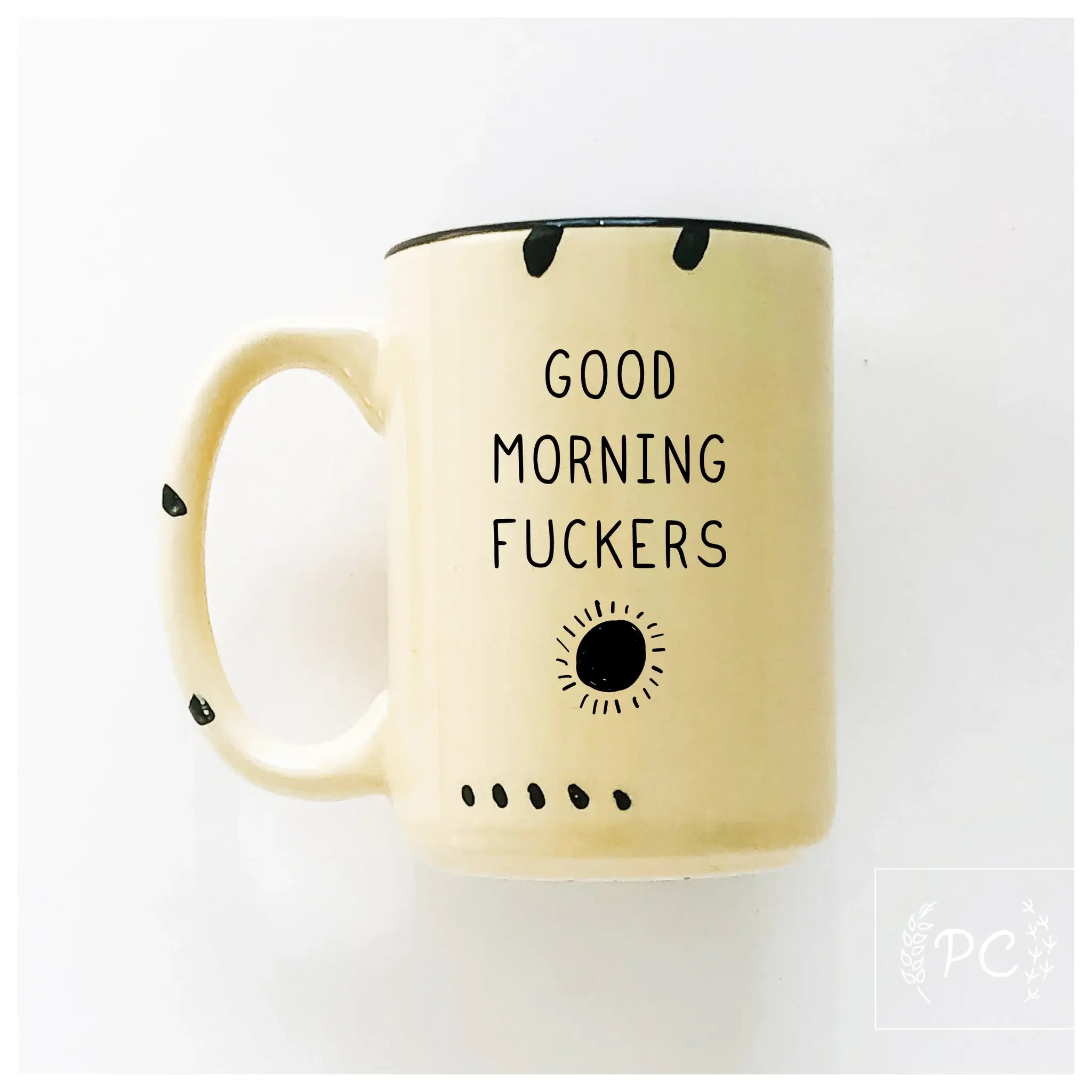 Charming & cheeky mugs by Prairie Chick Prints are the perfect addition to any mug collection, great for gift giving or heck just keep it for yourself to enjoy your morning cuppa. So what are you waiting for? Made to order. Individually heat pressed on a ceramic mug with a charming enamel rustic aesthetic. Best ordered in groups of 12 for shipping. A box holds 36. – printed on both sides so all can enjoy – large & wonderful 15 oz. size – hand wash suggested (dishwasher-safe top rack, avoid extreme heat & sanitize cycles) – microwave safe because reheating happens ;) – featuring 7 pastel colours as well as it’s chippy hand done markings, each one is unique – designed & printed in my home studio, Sherwood Park, Alberta Rustic sublimation mug design © Crystal Derouin Design Inc./Prairie Chick Prints. Sweary mugs, funny mugs, chippy mugs, farmhouse mugs, vintage mugs, rustic mugs, retro, enamel, friend gifts, morning coffee, tea mug, novelty gifts, cute mugs, profanity, cheeky