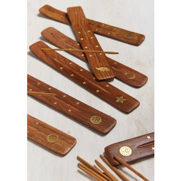 We love this classic natural wood single incense stick holder. Each displays a beautifully designed representation of a spiritual symbol of an om, sun, tree of life, moon, yin yang, elephant, or star in a superbly contrasting brass finish. Completed by small stars down each side of the ash catcher, make it your go-to star gift! Hand Crafted In India 3.5 x 25.5 x 1.2cm Sustainable Sheesham Wood & Brass Enhance meditation, home and social time with our beautiful incense burners, glass tealight holders and embossed glass lanterns. Handcrafted in the spiritual home of the seven Chakras, symbols of divinity and celestial deities, they make super thoughtful gifts and illustrate Indian decor at its best!