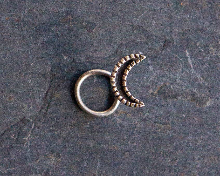 Beautiful hand made nose stud in sterling silver. This style is a beautiful crescent moon, connecting you to your lunar and feminine energies. The post is 20 gauge sterling silver, in a corkscrew shape for a secure fit. This is the most standard nose piercing gauge size, but please research if this will fit for you. Looks beautiful on a single nostril, or with the Starburst Sun on the other nostril for a beautiful solar/lunar balance!