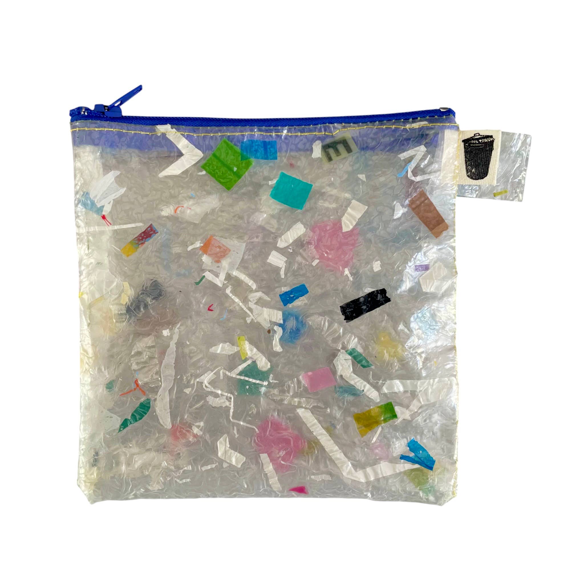 This plastic pouch is made of Cool Trash’s proprietary, legendary confetti plastic! Little bits of produce nets, plastic bag offcuts, tiny colorful scraps suspended in clear plastic. It’s magic. 100% recycled fused plastic. While not completely waterproof, these pouches are water resistant - so you could take it on the river, just don't tip the canoe. Zipper color chosen at random. Each pouch is completely unique and handmade! Pouch dimensions range slightly from 5"-5.5" in length and 6.25"-7.5" in width. Average pouch size is approximately 5x7" Each item is handmade, one-of-a-kind, and may come with its own small imperfections. If any part of this item should break or defect, I am more than happy to repair it! just email me: emma@cooltrash.net