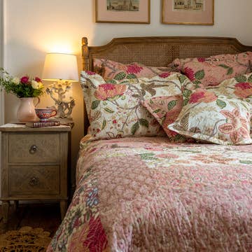 A one-piece quilt filled with natural recycled cotton; a by-product from textiles that may have gone to landfill. Beautifully crafted, the Malli reversible quilt is a fine example of the ancient artisan craft of Indian block printing. Each hand-applied print is carefully considered and this attention to detail brings a unique quality to every completed piece, with no two being absolutely identical. Adorned in pretty floral patterns on both sides and in complementary color schemes of gold, pink, grey/green, navy and white. Defined borders are edged in navy blue. 210 x 240cm 100% cotton outer with 100% recycled cotton filler The outer cotton is not recycled Hand wash separately in cold water and dry flat. Do not tumble dry. From our oldest supplier who we started business with in 1997. Our supplier is a member of the Fair Trade Forum India which is the Indian national member of the WFTO. The company also supports charitable and community-based projects.