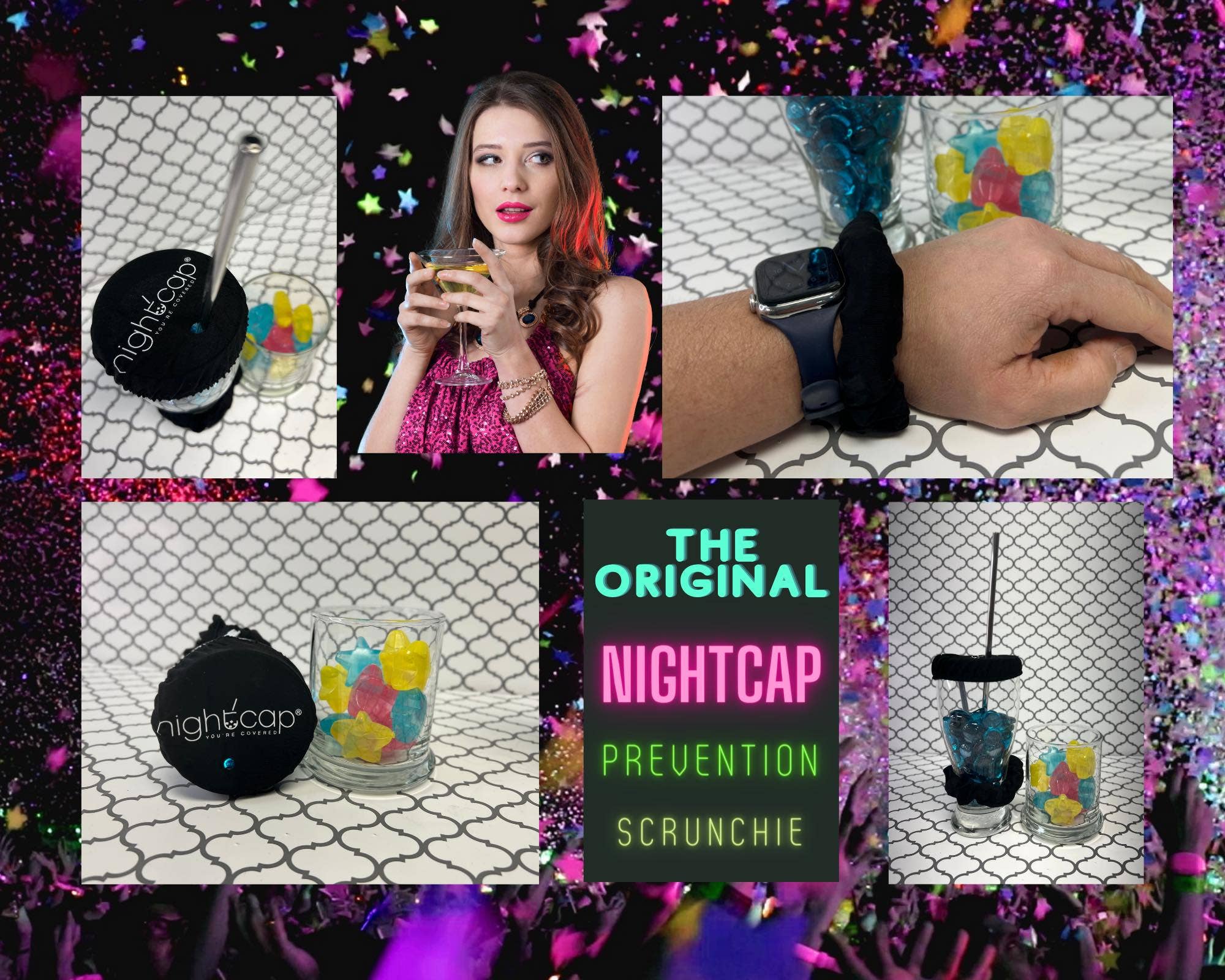 *DISPLAY INCLUDED FREE ON INITIAL ORDER The NightCap Scrunchie is the hottest new self defense product on the market. With over 500,000,000 views on TikTok and featured on ABC's Shark Tank, this self defense drink cover will be the item in your store that everyone is talking about. Protect Yourself- This NightCap Scrunchie is a dually functional scrunchie that can be used to cover over most cups and glasses to prevent pills and powders from being dropped into a drink. How it Works- Simply wear on wrist or in your hair until needed. When ready, pull drink cover out of hidden scrunchie pocket, place over drink, pop in a straw and Enjoy! Reusable and Easy to Clean- this NightCapIt drink cover scrunchie is reusable and machine washable. Throw in the washing machine after use and lay flat to air dry.