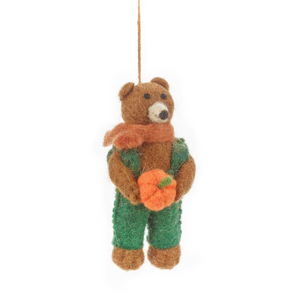 A delightfully decedant decoration for any home this Autumn. Crafted from beautiful, mottled felt leaves in an array of vibrant autumnal colours, each one hand stitched onto a felt wrapped wire wreath, with a perfectly plump needle felted pumpkin perched perfectly in the centre. This gorgeous wreath makes for the perfect home decoration this autumn or Halloween. Handcrafted in Nepak under fair trade working conditions from sustainable and biodegradable materials.