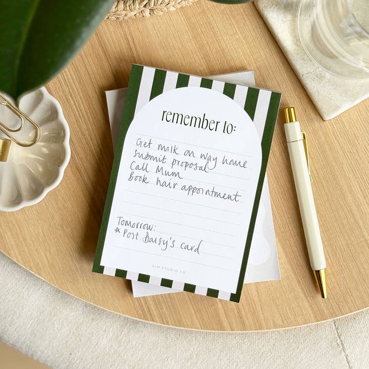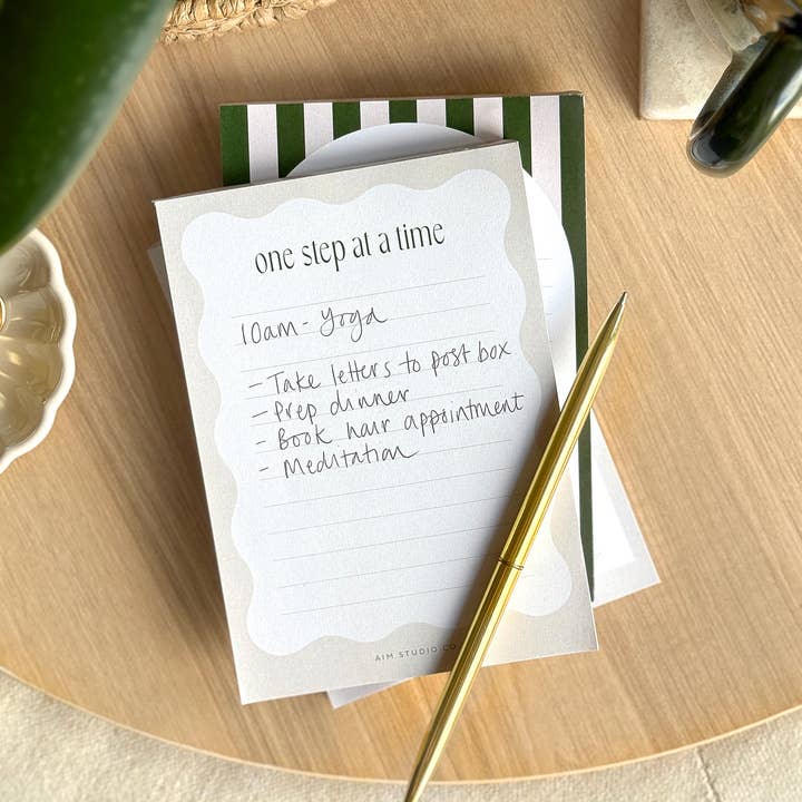 Complete with a thick card cover, this beige stripe to do list features 50 thick lined pages and a sturdy backing board. It's slim ratio makes this notepad perfect for to do lists, shopping lists or getting quick ideas out of your mind and onto paper. Ideal for an office desk or bedside table, the neutral beige & white stripe design paired with minimal "lists & ideas" typography provides an elevated, classy addition to your stationery collection. Designed exclusively by AIM Studio Co and printed in the UK. Details: - Slim DL size (148 x 105mm) - Premium 120gsm inner paper (no bleed through) - Thick 350gsm card cover - 50 pages - Tear off sheets - Lined paper - Neutral, calming colour scheme