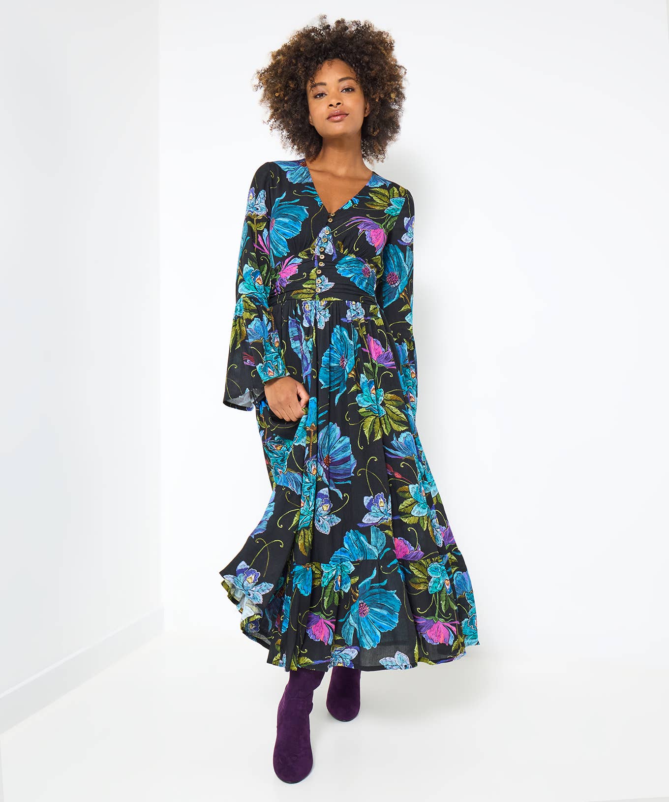 Elegant and flowy tiered maxi dress made in our desert solstice print. Features a button-up bodice and draw string waistband for a customizable fit of ultra flowy or cinched waist. Slightly belled sleeves with a ruffle adds the perfect touch of boho. made with 100% plant viscose Regular fits XS to 35/36" waist and 39/40" bust max PLUS fits to 46/48" waist and 50/52" bust max