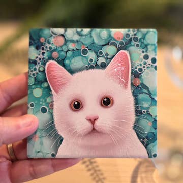 Fika Time (Swedish for coffee time) on porcelain coaster cork backed. The porcelain tile has rounded corners and is 4in x 4in x .25in approximately.