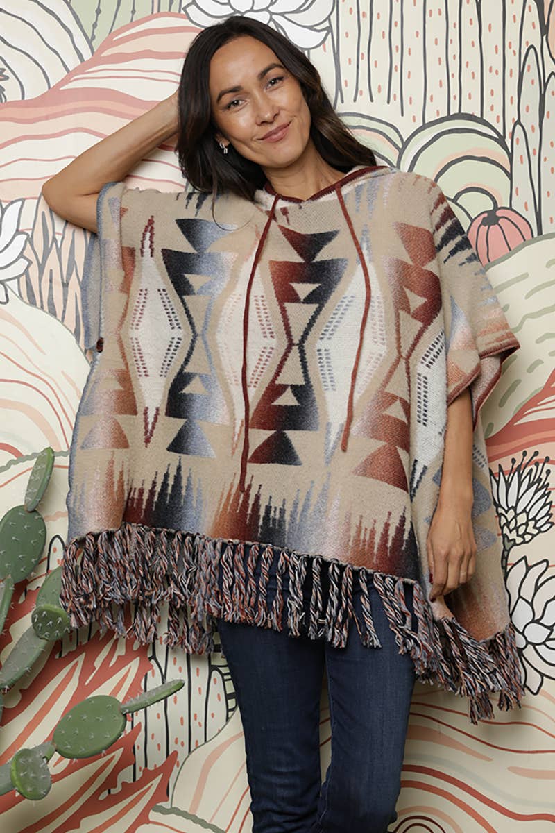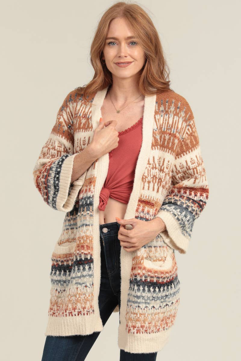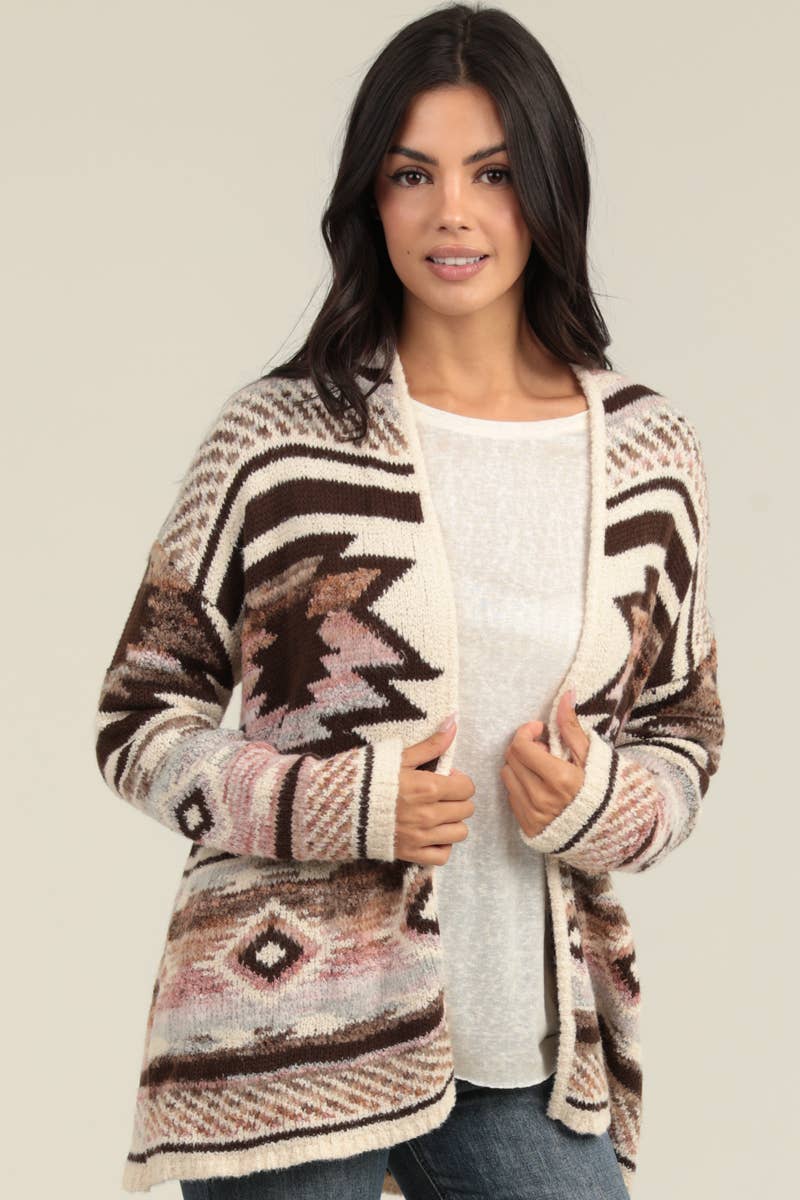 NHS56-ASIS FRINGE HEM AZTEC CARDIGAN SWEATER
