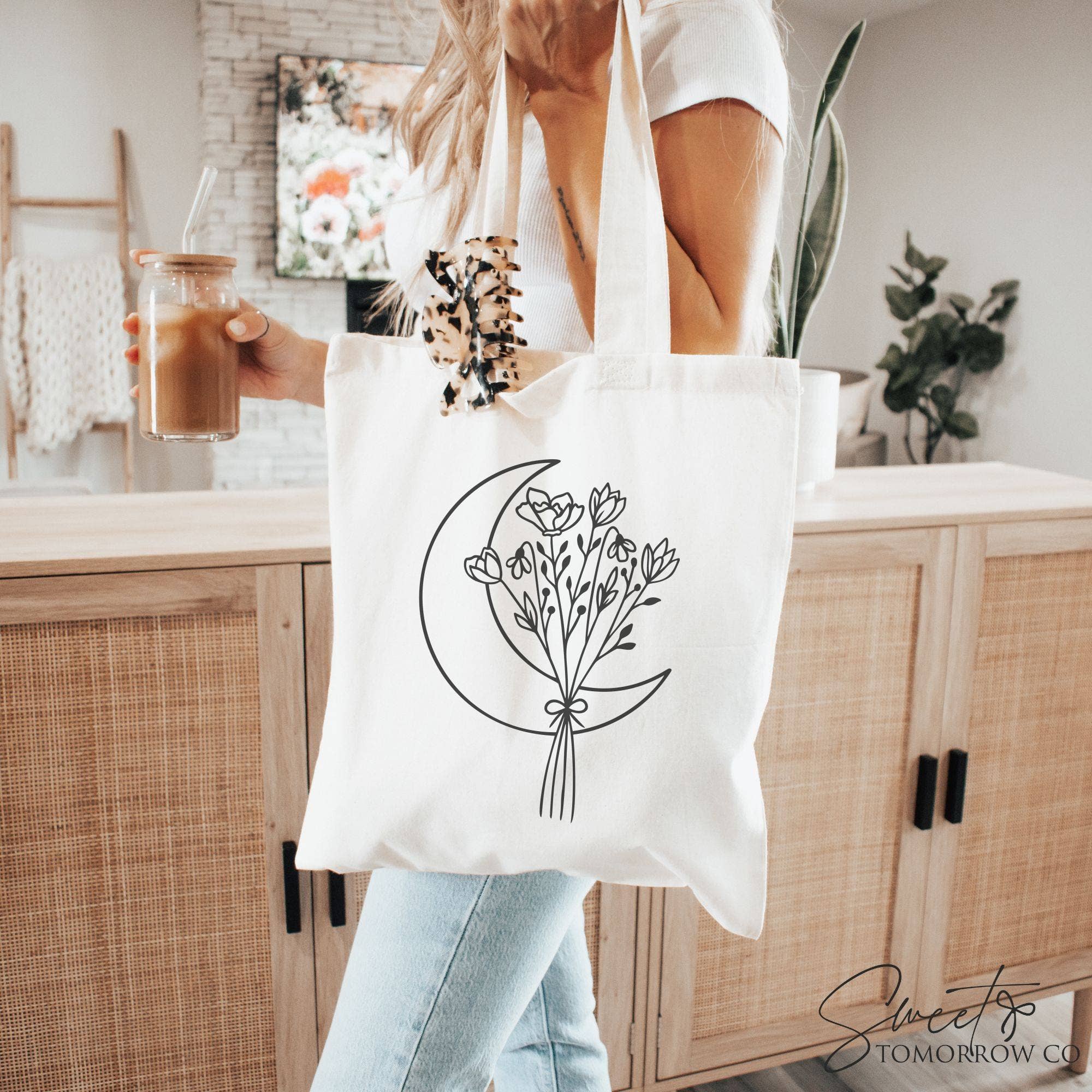Celestial Moon Cotton Canvas Tote Bag Medium Grocery Bag • medium tote 15.5" H x 12" W (not including handles) • premium durable canvas material • heavy duty canvas handles • design is handprinted into the fabric (it is NOT a sticker & will not peel) • one sided print • easy spot clean with soap and warm water Do NOT machine wash ***end product including color and placement may slightly vary from the mockup picture. Can be purchased one sided or with the design on both sides. *Please keep in mind that each product is handmade, so slight variations may occur.