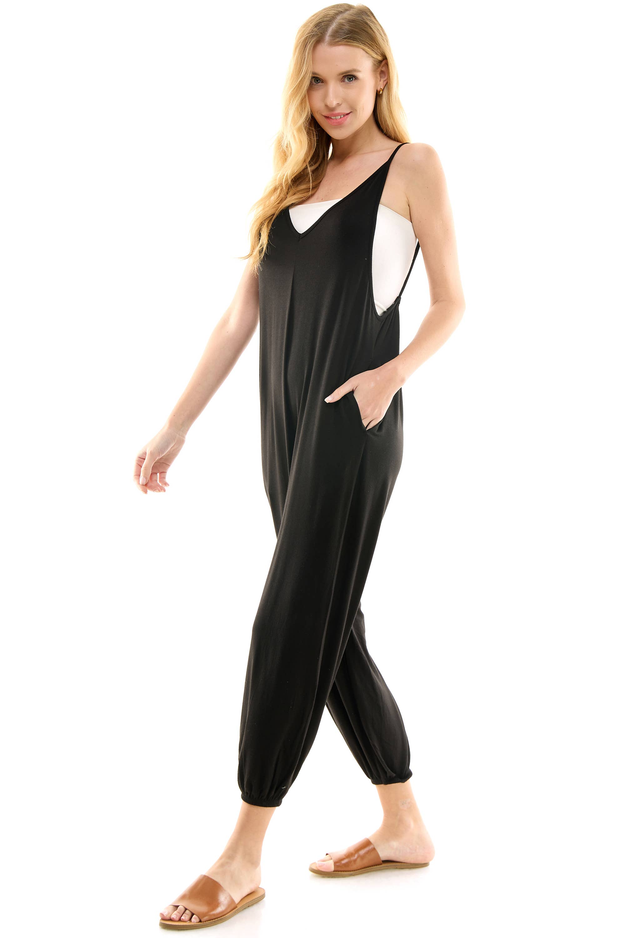 #P30077 Sage Deep V Neck Skinny Leg Modal Jumpsuit with front pockets. 96% Rayon Modal 4% Spandex