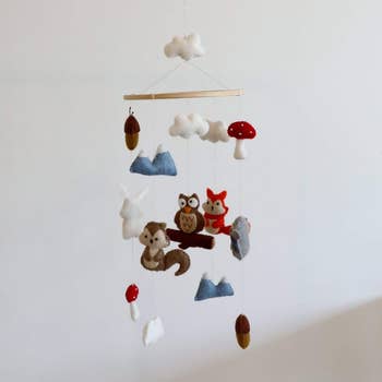 This whimsical baby mobile features handcrafted felt mushrooms and acorns in warm, earthy tones. Each piece is needle felted from natural wool and delicately suspended from a smooth wooden hoop. The playful design brings a touch of woodland magic to any nursery, perfect for nature-loving families. * Handcrafted from 100% wool felt * White Felt frame * Lightweight and ready to hang * Designed for decorative use only