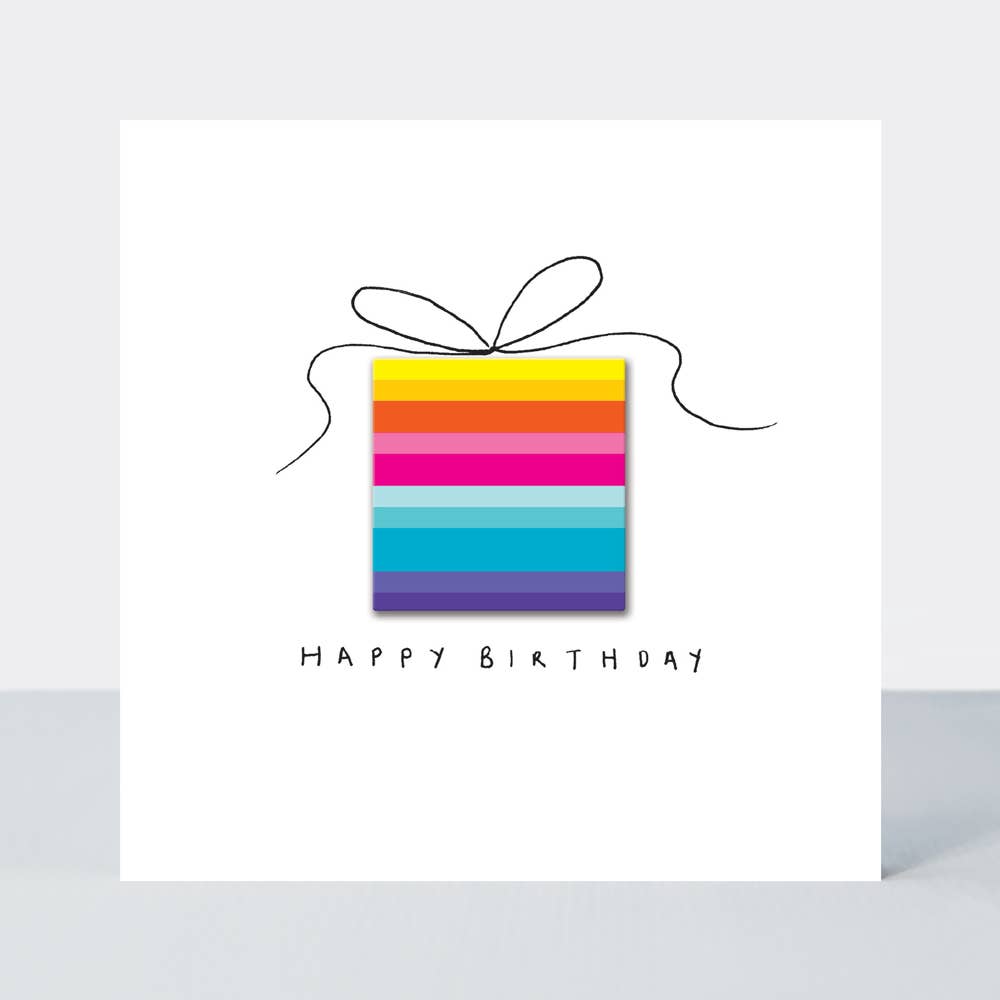 A playful birthday card for anyone who loves colour. This simple, sweet design is printed with flourescent inks on high quality textured board. Each card features a vibrant hand-applied attachment, complemented with a hand-drawn caption. Supplied with neon pink envelopes. SIZE: 125mm x 125mm FINISH: Hand-applied 3D attachment Printed in Nottingham, UK on FSC board
