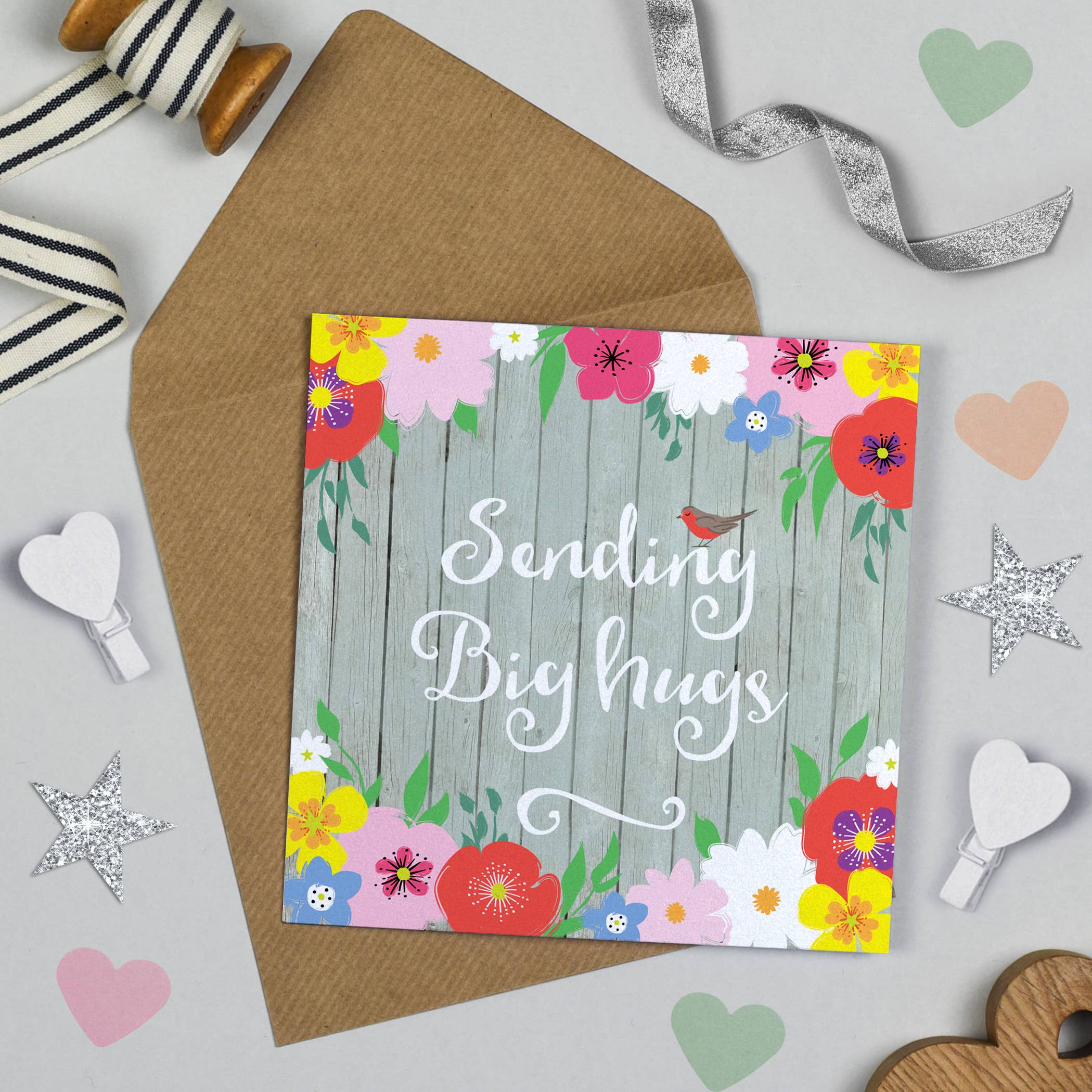 Feel Brighter Soon card with rustic sage wood background and bright floral design. Digitally printed on luxury card. Send your friends and family a thoughtful greeting with this pretty square folding card. 150mm x 150mm Blank inside for your own message Supplied with a square recycled envelope Luxury 300gsm FSC-certified board Designed and printed in the UK