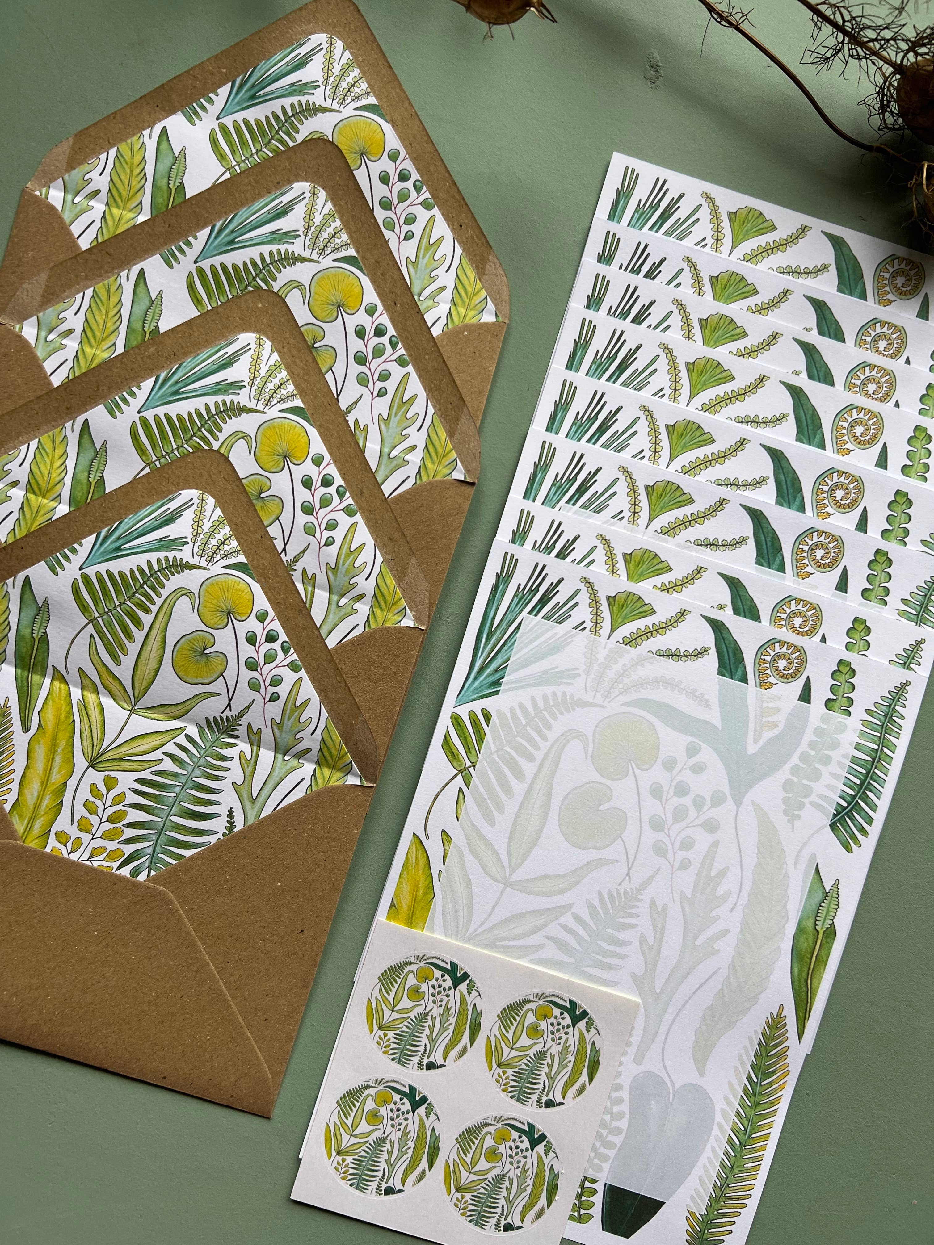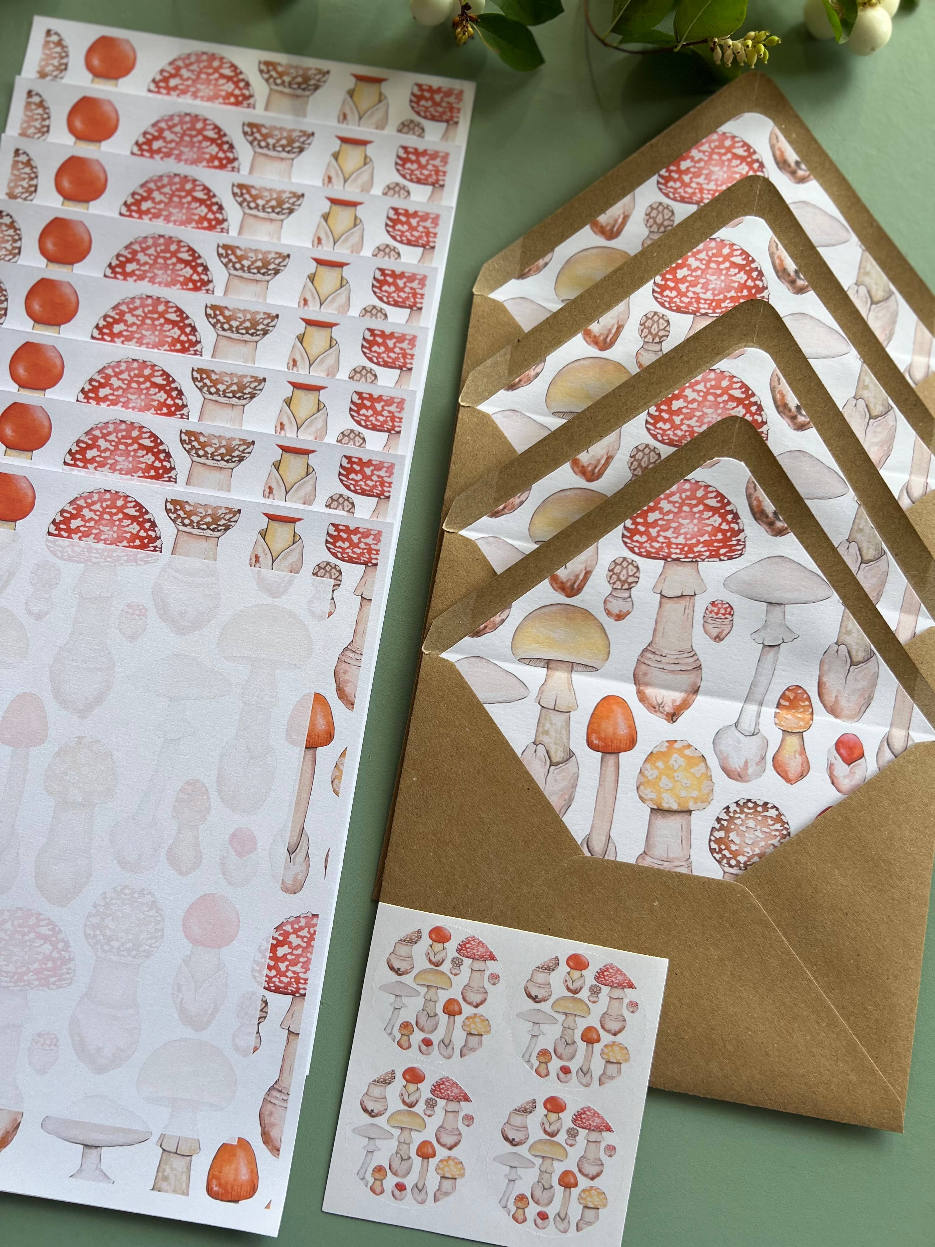 My best selling products other than prints are these letter writing sets. They are great for gifting, keeping in touch with penpals and friends, sending snail mail and saying thanks for all the pressies received at Christmas or on birthdays. Each set includes - 8 Sheets of Printed A5 Writing Paper, on 120gsm FCS certified paper 4 Lined Kraft Envelopes 4 Round Paper Stickers All neatly packaged in a cellophane bag.