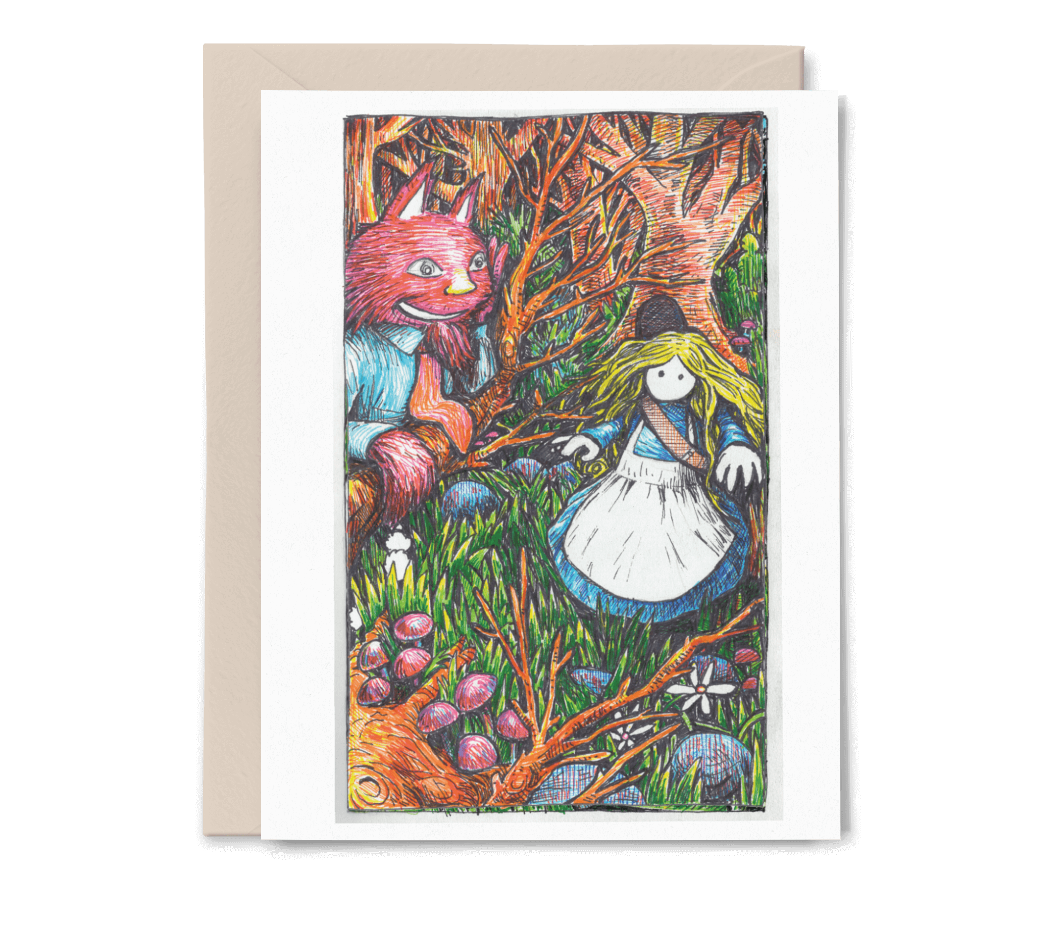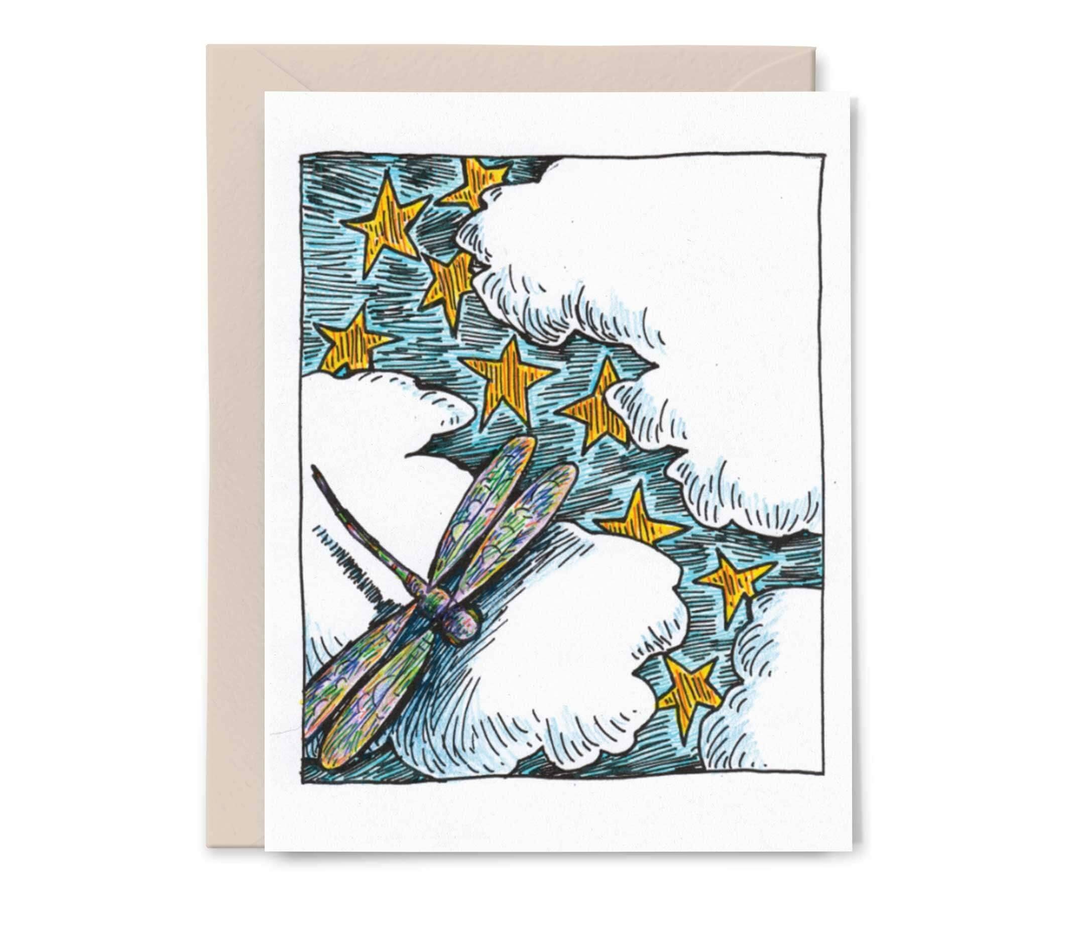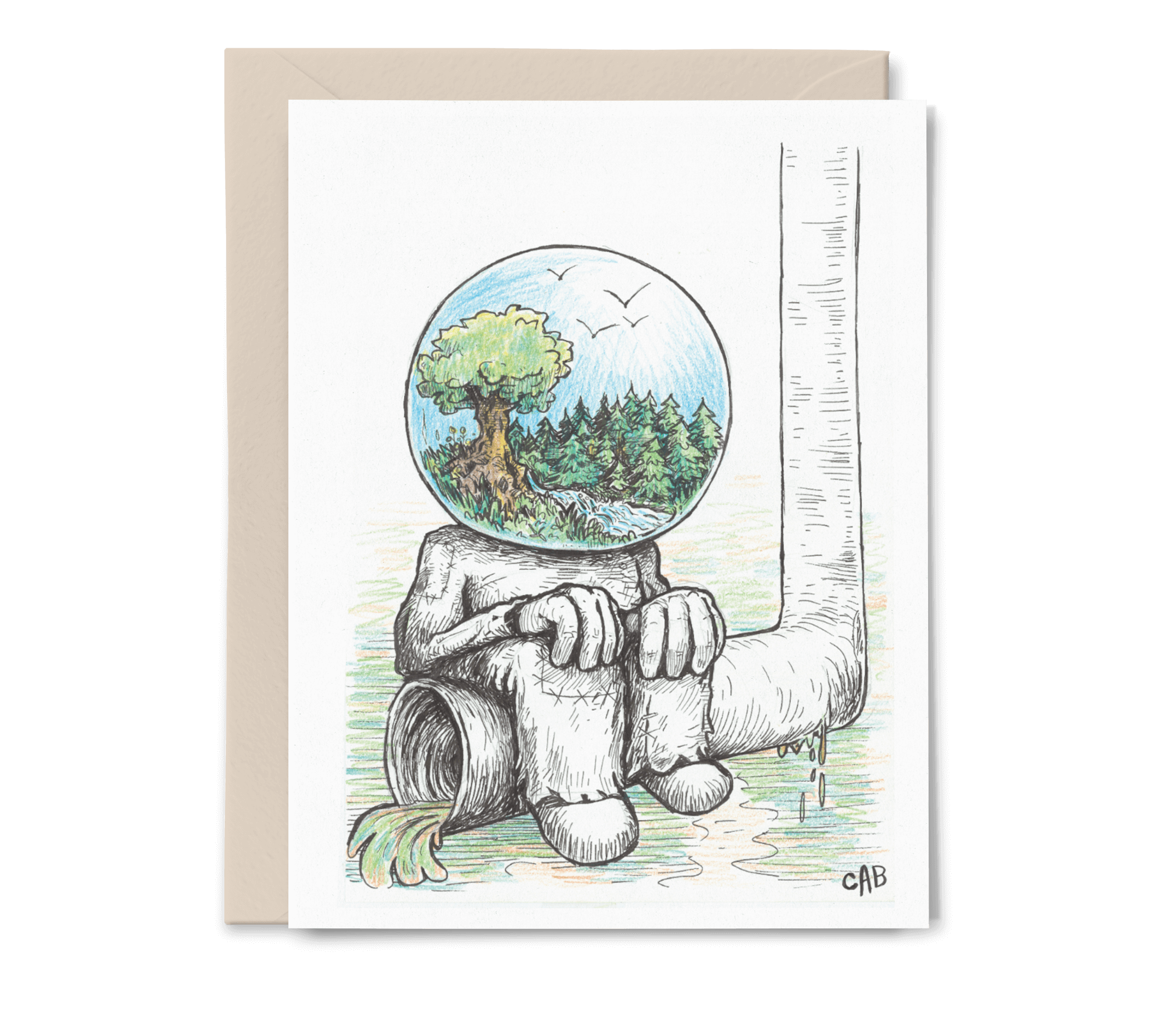 From the Cory Bushore series. A portion of proceeds from this line benefits the Kitsap Humane Society. Cory’s surreal, often humorous, sketches play with natural and fantasy, pushing for a pause from all the busyness, a moment to just be. - 4.25” x 5.5,” (A2), Folded - Blank inside - Note on back depicting artist + charity - Coordinating envelope - Thick matte cardstock (FSA certified) - Digitally printed - Comes in a cellophane sleeve Printed in Bremerton, Washington, in a woman-owned print shop.