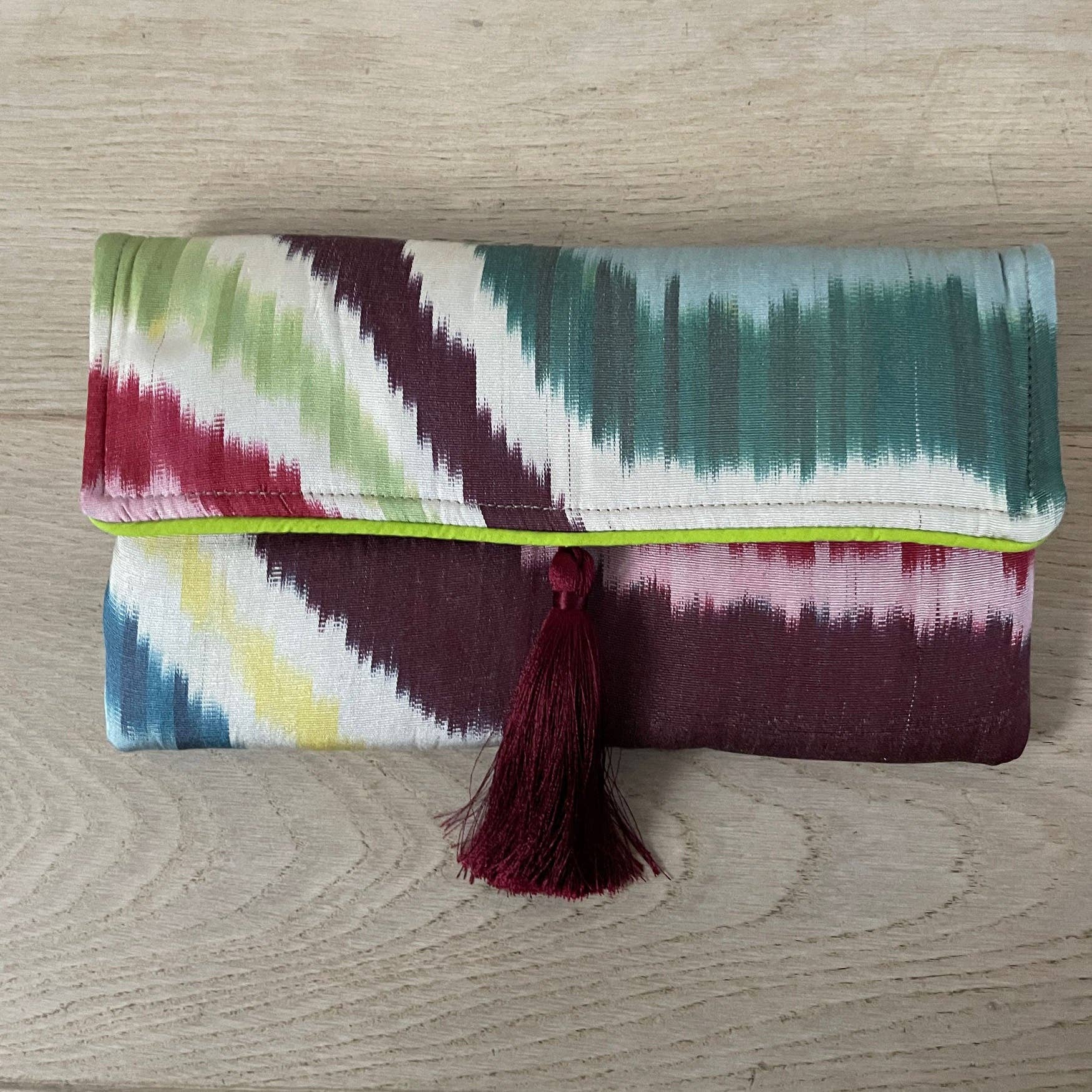 This beautiful handmade clutch features shimmering pearls, colorful floral embroidery, and beaded designs on a black velvet background.