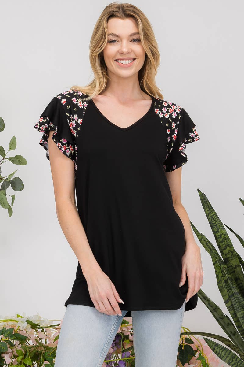 ANIMAL PRINT CONTRAST TOP WITH RUFFLE SLEEVES -CT43831B