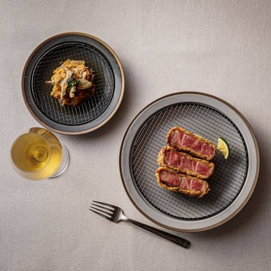 The beauty of unity and function in one plate. Produced in the largest pottery production area in Japan, this contemporary Mino-ware plate is coated in simple and modern colored glazes. It comes with a plated strainer, covering half of the plate. It is made in Tsubame City, Niigata, which is famous for its metal works. Together, they are ideal to preserve the crispyness of fried items, or serve steamed food. With the strainer detached, the plates can be used in everyday life. Size : 8.9"x1.1" (225x28mm) Metal net : 8"x4"(200x100mm) Material : Plate / Pottery ( Mino-ware ) Material : Metal net / 18-8 stainless steel ( Tsubame-city ) Black oxidized finish or Gold plated finish Origin : Japan Packaging : Individual box Plate: Microwave Safe, Dishwasher Safe Metal net: NOT Microwave Safe Wash with a mild detergent and a soft sponge before use. Do not use scrubbers with scrubbing or polishing powder as they may scratch the surface