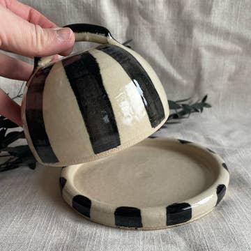 Our exquisitely thrown porcelain butter dish is a testament to fine craftsmanship, designed in two parts for elegance and functionality: a lid adorned with a loop handle for easy lifting, and a base dish featuring a snug collar for the lid to rest securely upon. Available in a selection of five tasteful colors, this dish is perfect for keeping your creamy, Irish butter fresh and spreadable, enhancing one of life’s simple pleasures - butter on warm, fresh bread. The dish’s charming appearance is complemented by an unglazed foot, revealing the smooth white porcelain beneath, and each piece is proudly stamped with our maker’s mark, signifying its artisanal quality.