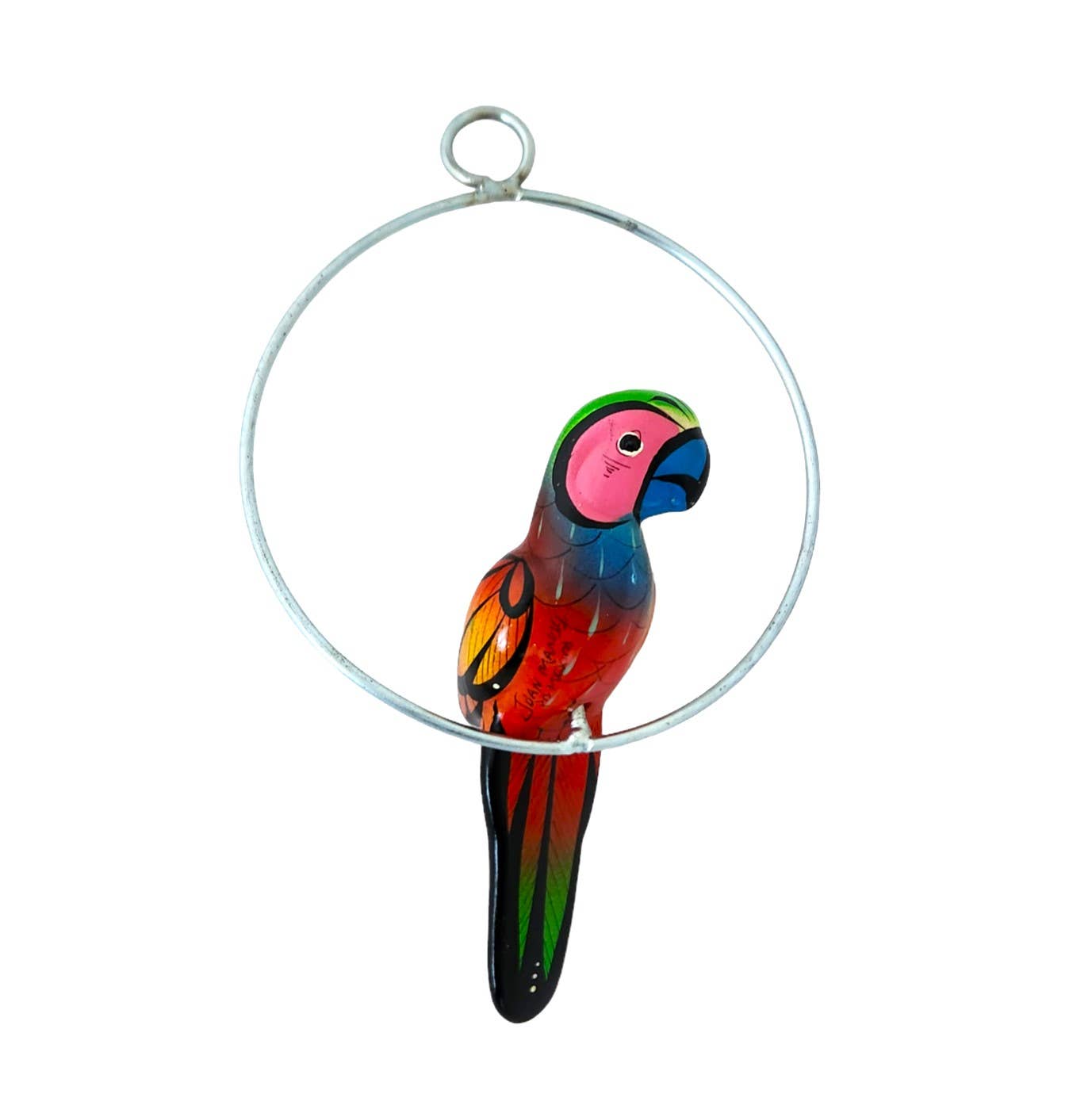 Flown in direct from Mexico, this handcrafted ceramic tropic bird is finished in an assortment of jungle colors. The bird sits on a perch that is packed separately. The bird can be placed indoors or out. It has a light varnished finish to repel water. The metal perch has a 10 inch diameter.
