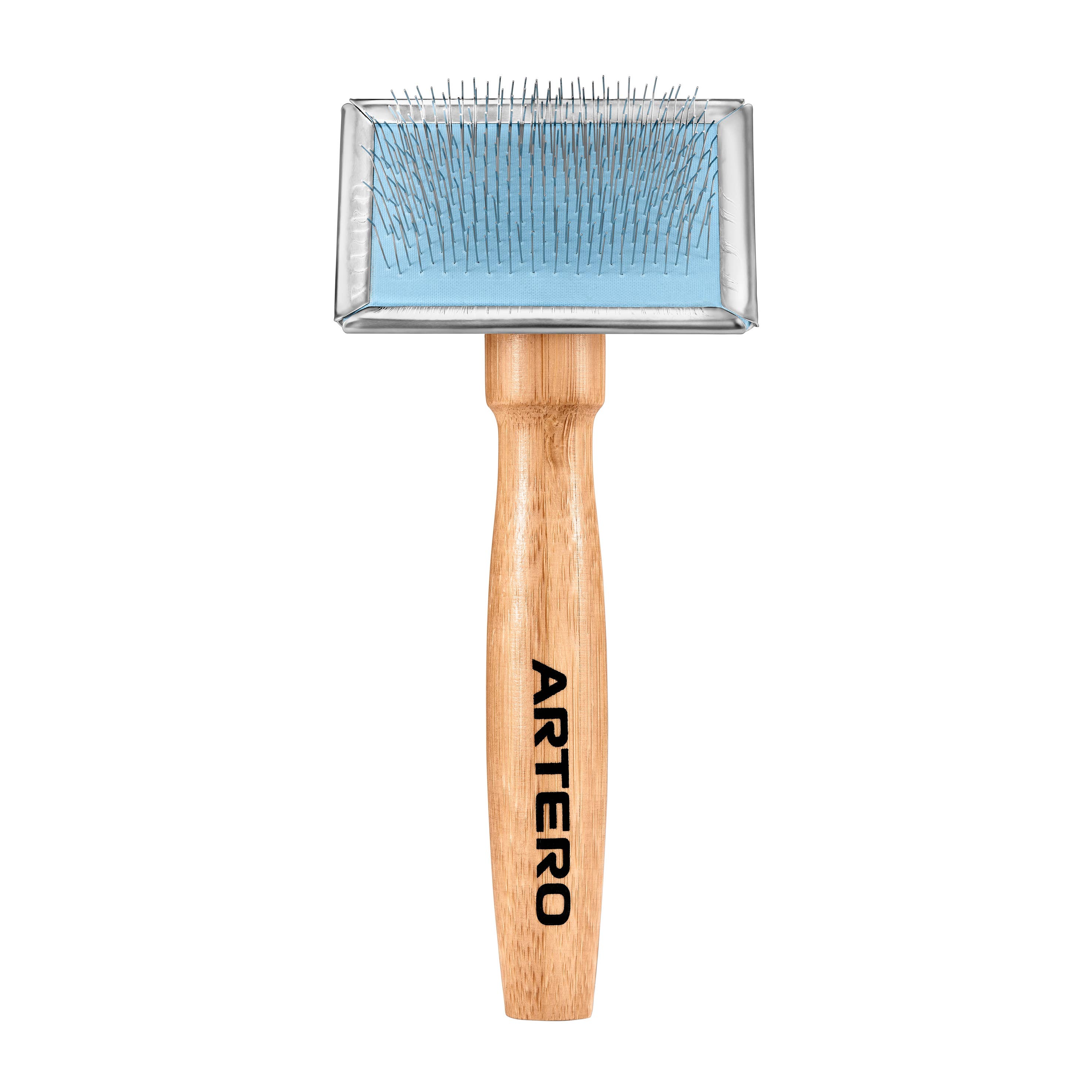 Ancols Ergo Universal Slicker is ideal for smooth, silky, long and short coats. It whisks away loose fur and had has bendy pins for comfort. The slicker is an effective moulting and detangling tool To use the slicker, slowly and gently brush the hair in the direction of the fur growth. The bendy pins will pull away loose hairs hair leaving a smooth and neat coat. If your dog is comfortable with the slicker, press gently on the tool to remove more fur from the undercoat. The pins of the slicker are bendy to prevent discomfort, however, do not press them into your dog's skin. To remove a tangle, isolate the fur and gently pull the slicker through the tangle, starting from the outside and working in as the fur de-tangles. To ensure your dog has an enjoyable grooming session, start gently. Pause or end the grooming session if your dog becomes agitated. Slicker pin pad dimensions:6.5 x 4.5cm *vid shows old packaging