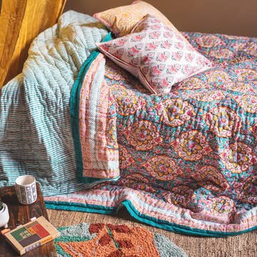 This hand printed Pretty Floral padded quilt is absolutely beautiful and is made using traditional block print techniques. Handmade from 100 % cotton in Jaipur, India.