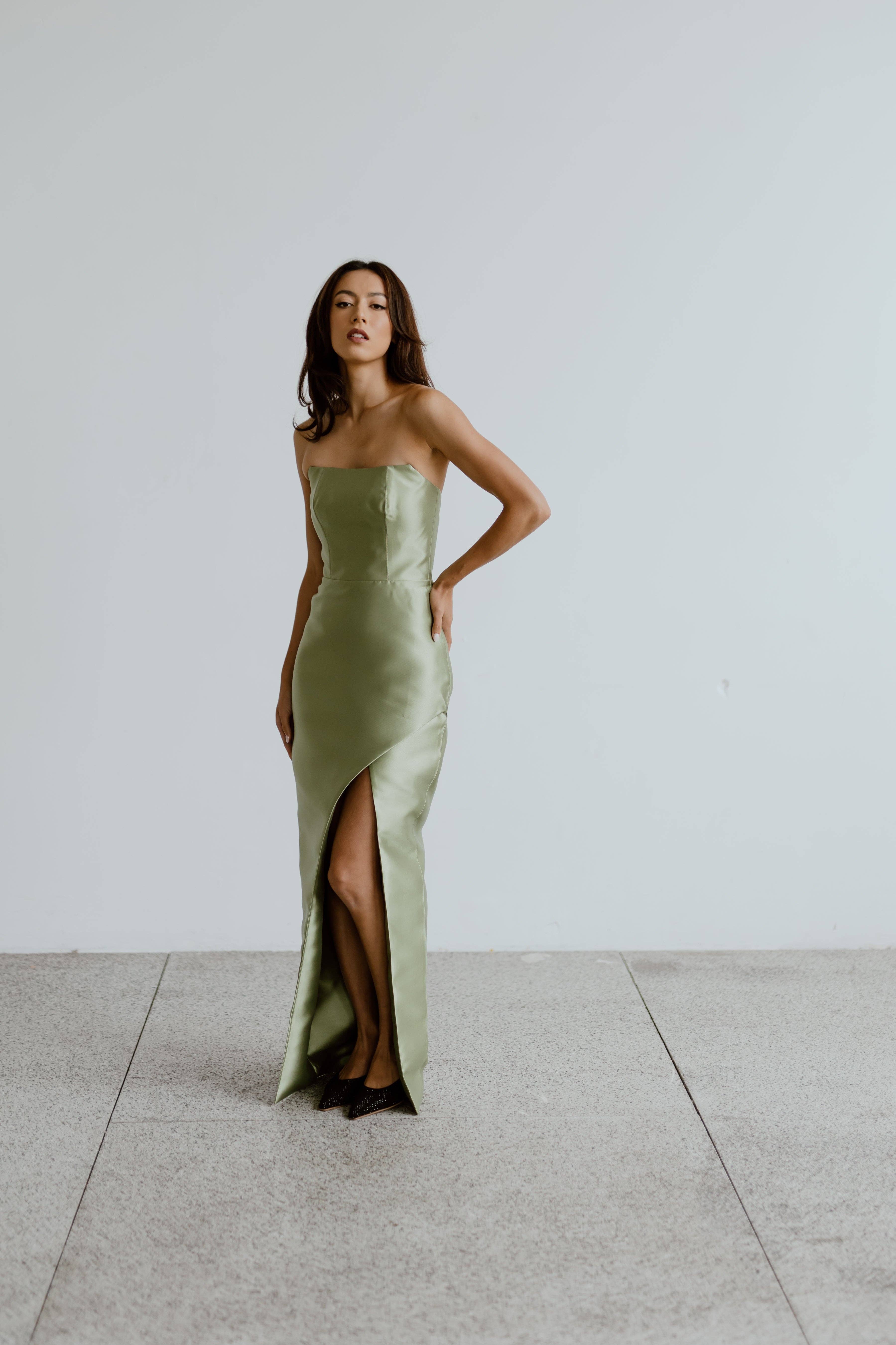 Crafted from heavily weighted satin, the Sentiment Gown was created for bridal or occasion wear. Featuring a conservative cut with captivating and shapely features. With a plunged neckline and mid-thigh slit, The Sentiment Gown is finished with an open back and functional covered buttons down the centre back. Available in Ivory or Black. Please allow five days for processing time. Ethically Made in Australia.