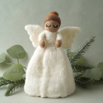 This majestic angel will add the perfect touch to your tree or mantle this holiday season. Accented with a beaming halo, vibrant wings, and hand-felted heart, this angel will bring a sense of love to your holiday décor. 14” tall. 100% felted wool.
