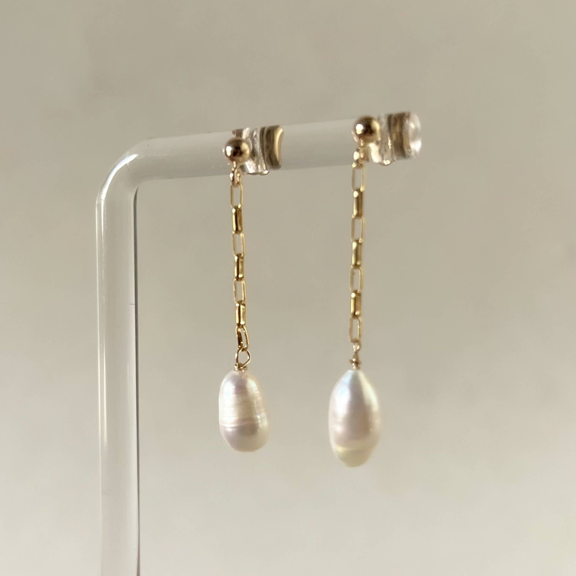 Paired with our Chain + Pearl Drop or Loop earring, this double post earring is the perfect match for the gal looking for some subtle asymmetry. Handmade with freshwater pearls & 14K gold-filled chain that is hypoallergenic & won't fade or tarnish over time. Sold as a pair or individually.