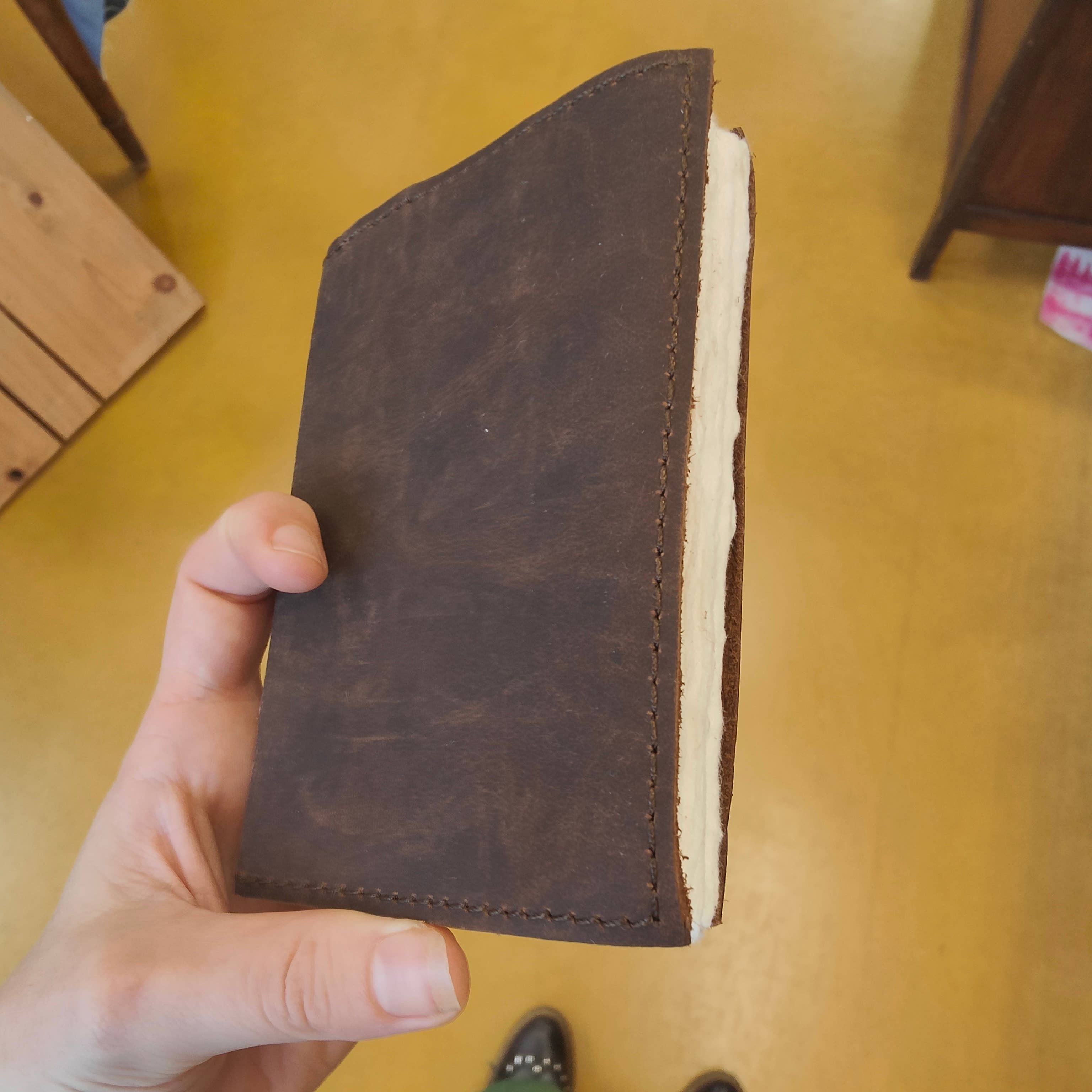 The traveler's notebook, classic with its oiled leather cover, practical with its closure strap, inspiring with its handmade paper, vat-made, in parchment finish. The inner notebook is removable, so it can be refilled (96 pages). It closes with a leather strap and has a flap; it's the travel notebook you never leave or your personal journal. Its brown oiled leather cover gives it a masculine, timeless look. Ideal for Father's Day, this notebook can hold your thoughts, recipes, stories, drawings; the paper supports watercolor. Vegetable tanning It is available in 3 sizes: 9 x 12 cm (without flap or strap) 10 x 17 cm (with flap and closure strap) 15 x 22 cm (with flap and closure strap) notebook / parchment paper / handmade paper / handmade / oiled leather / travel notebook / Christmas gift / Father's Day gift / men's gift / home decoration /