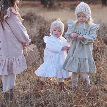 Long puff sleeve girls midi dress with triple decorative tucks. Rounded waist seam and drawstring opening in back. Made from sustainable organic cotton gauze and pigment dyed in brown for a unique finishing.