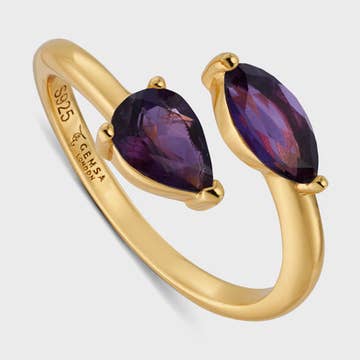 Blue topaz glass and iolite two stone ring Dive into the elegance of the Nora Ring Blue, beautifully crafted with 22 carat gold plated brass. This adjustable ring features a mesmerizing arrangement of blue topaz and iolite glass stones, each varying from 0.5 to 1 cm in size, evoking the serene, captivating essence of ocean hues. 22 carat gold plated brass Set blue topaz and iolite glass Adjustable, stone size: 0.5-1 cm