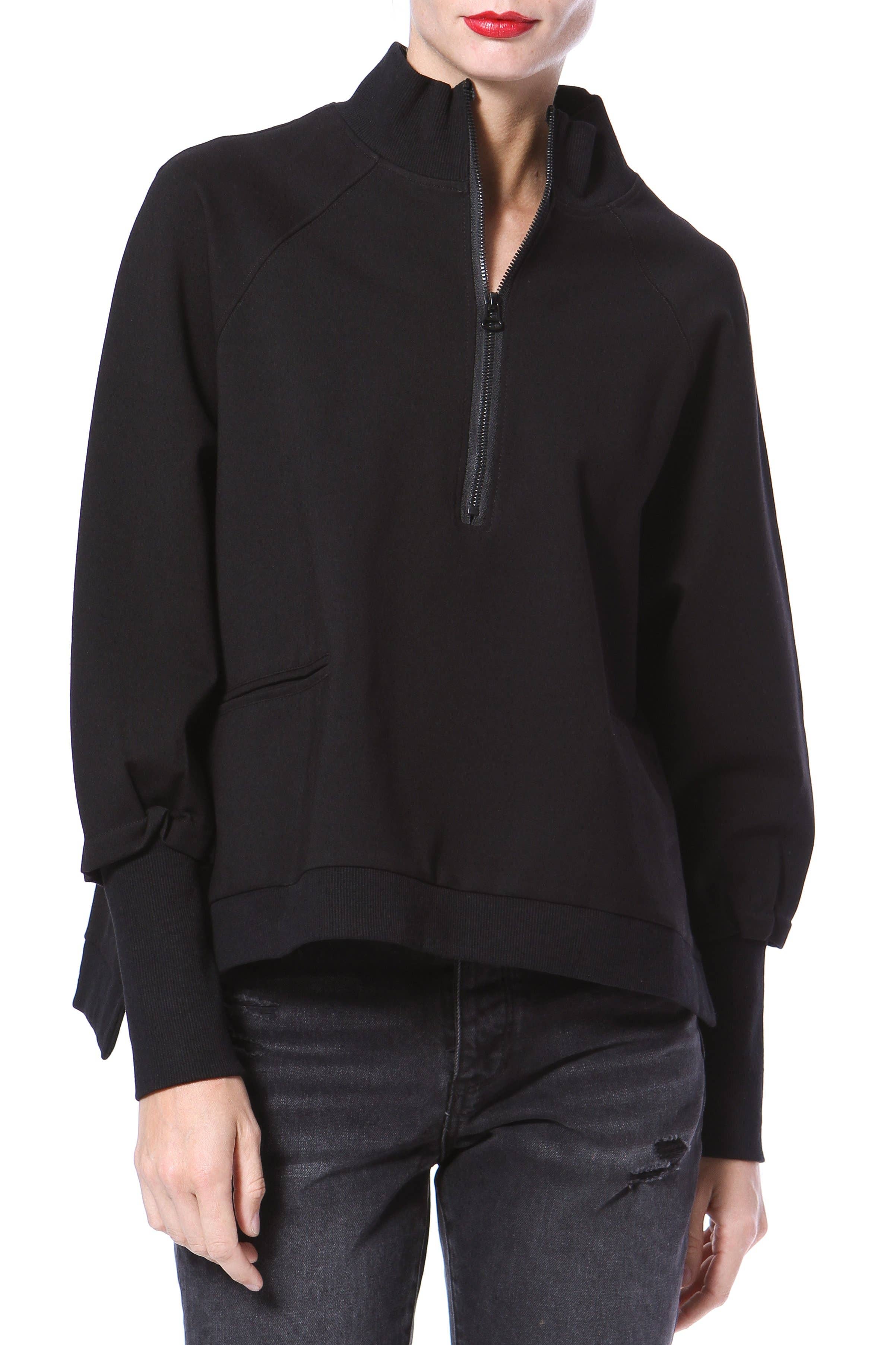 A chic shirt with white trim is designed for a statement-making vibe: button front, long sleeve with buttoned cuff, and asymmetrical hem.