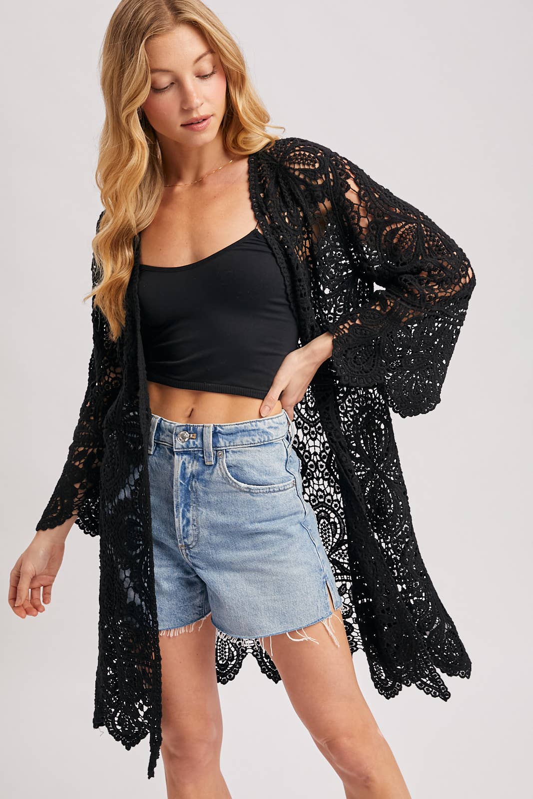 An open-knit crochet lace top featuring a scoop neck, 3/4 wide bell sleeves, oversized fit. Wear yours over a bathing suit as a cover-up or pair it with a tank underneath. * Layering garments not included. -Model is 5'9" and wearing a Small