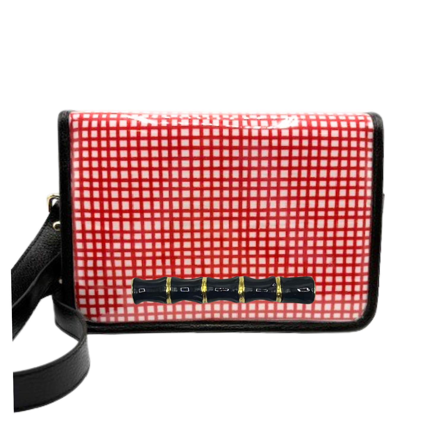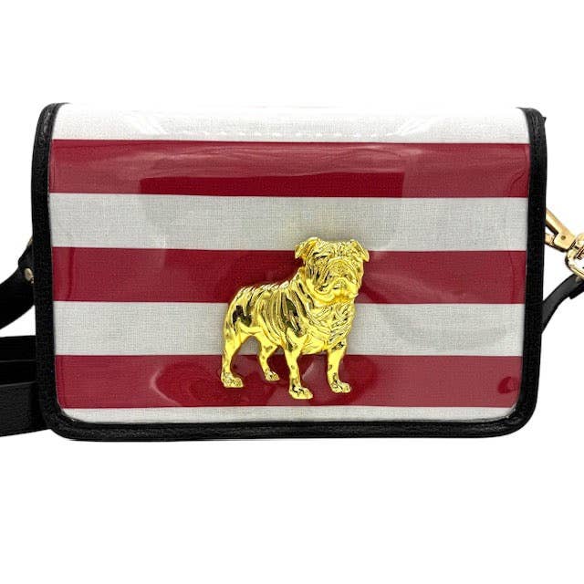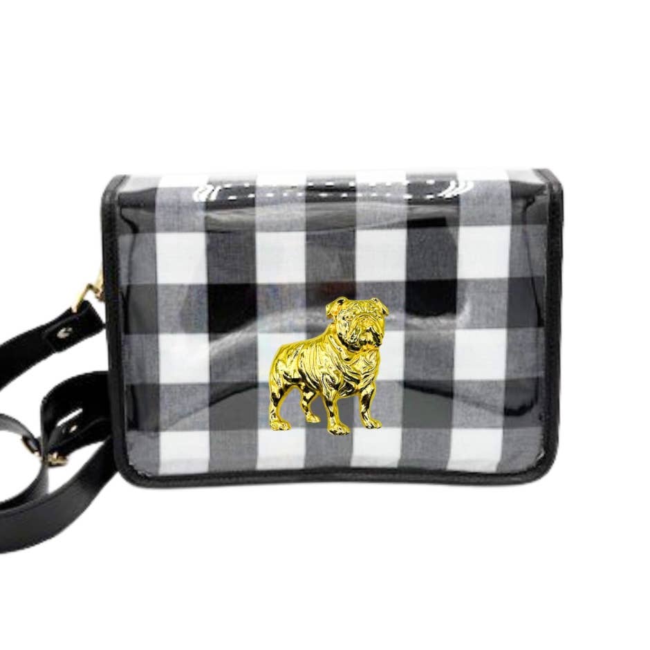 * Transparent on 3 out of 4 sides * Meets standard stadium size requirements * Magnetic snap closer * Removable faux leather strap * Interior contains a pocket * 9.5 x 6 x 2.5 Add a playful-yet-chic touch to your game day outfit with this unique crossbody clear bag. It features a bold red and white grid pattern with a gold bulldog accent. The reverse is lined with black linen, clearly visible through the back and sides of the bag for a further statement! The removable faux leather strap is adjustable to act as a traditional shoulder strap or as a crossbody. This bag meets standard stadium requirements both in size and transparency.