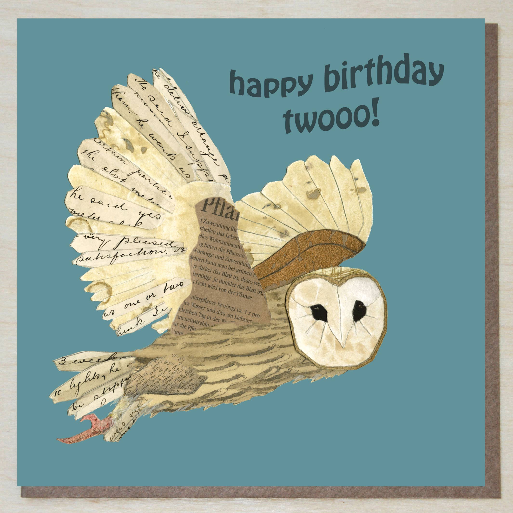 'Twit Twooooo! ' Quirky and original birthday card, created in collage, showing an owl in flight. Designed and beautifully printed in the UK on gorgeous, sustainably sourced board. 15cm x 15cm with 100% recycled kraft envelopes, supplied unwrapped with an easy-peel removable label holding card and envelope together. Cards can also be supplied in biodegradable cellos, please let me know if you would like this option. Blank inside for your own message. Windsock Press