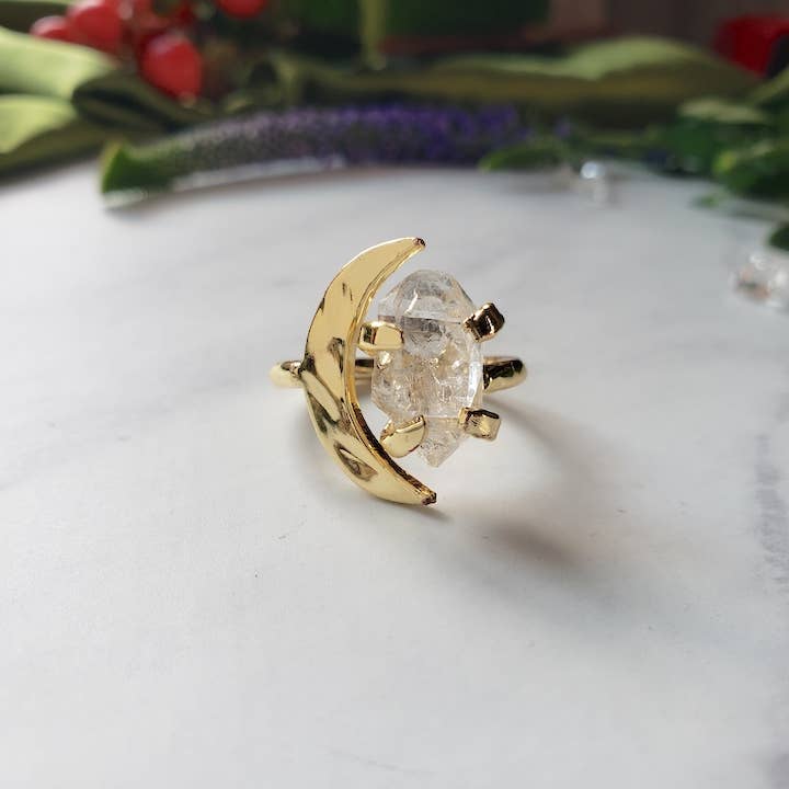 Diamond Quartz Crystal Moon Ring - 14k gold plated