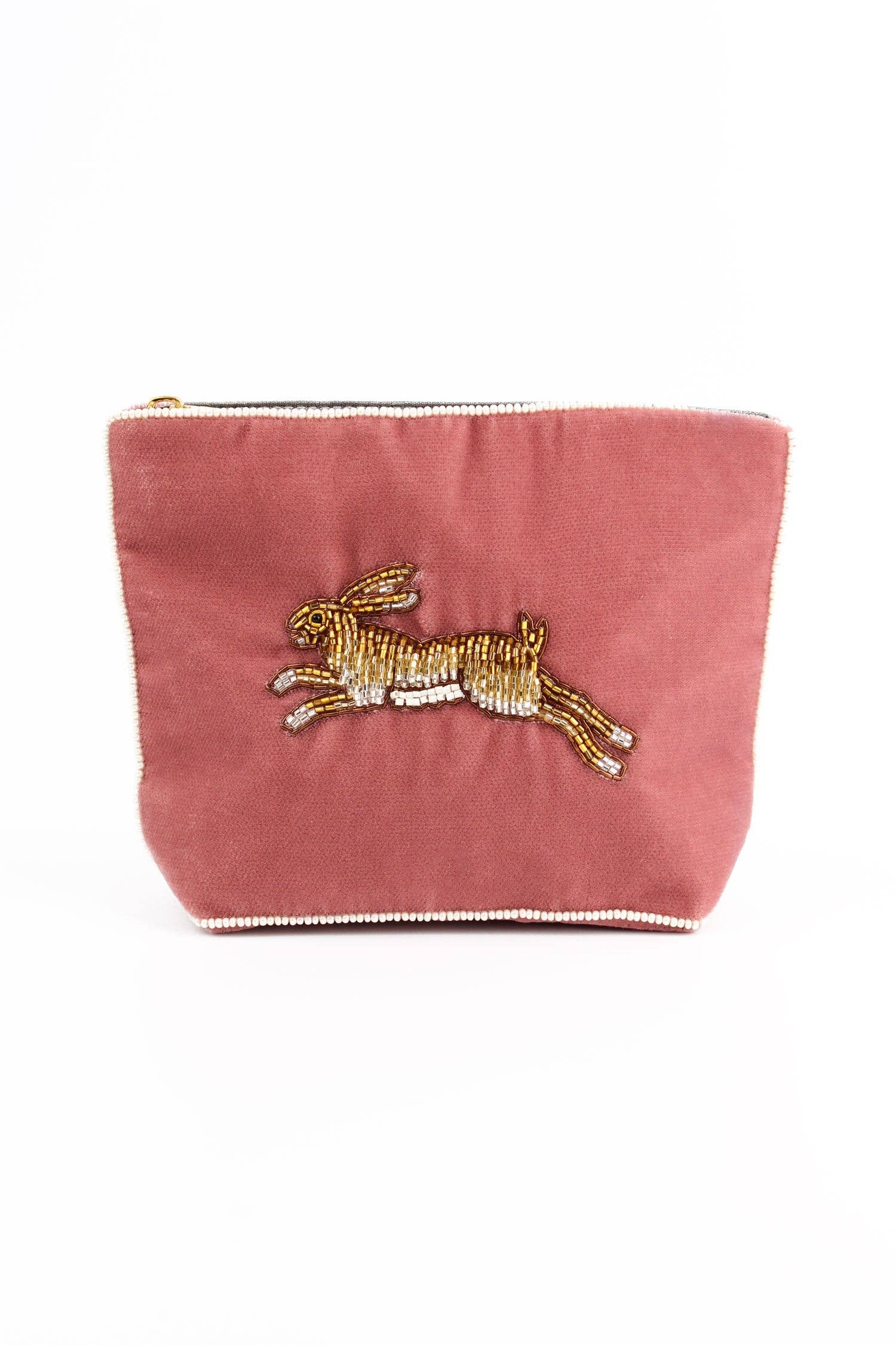 Perfect for animal lovers, our playful hare medium pouch is a must-have this season. Made from beautiful gold and bronze beads on a dusty pink velvet. -Handcrafted by talented artisans in India. -Approximately 180 x 130mm with a 65mm gusset. -Made from 100% polyester velvet with a water resistant lining and featuring glass bead embellishments.