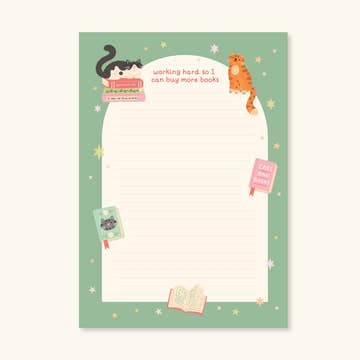 A cat notepad perfect for any list writing crazy cat lover. At A6 in size it's ideal to keep on a desk to jot down notes or write a to-do list. A great little piece of stationery for your customers to add some cat flair to their work space. > A6 (105mm x 148mm) > 75 tear-off sheets > Lined pages > Packaged plastic free with a branded belly band > Designed and printed in the UK Each sheet features the same design of a simple black cat at the bottom and the word 'notes' also in black at the top.