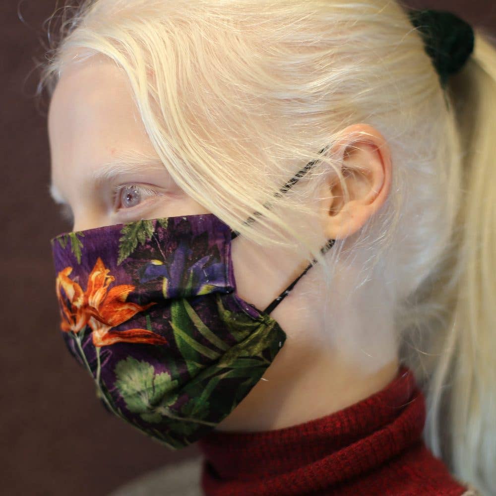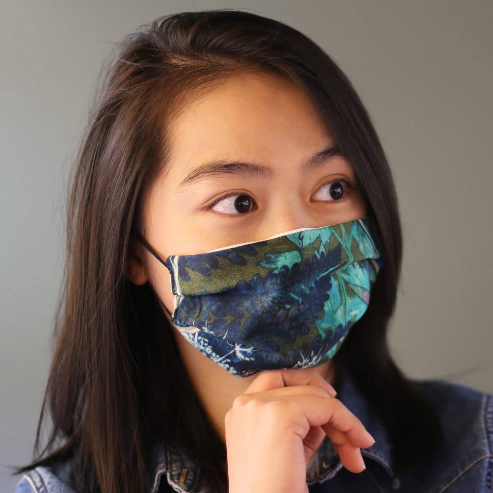 The flowers of summer as they have never been seen before. Brought to life with various shades of regal blues and crisp, clean whites this design will make an excellent addition to any room. Each face mask features Gillian Arnold's popular Cascades of Blue design. Made From Our face masks feature multiple layers of 100% soft cotton fabric on the inside. The front printed layer is a tight weave satin polyester with elastic ear straps. The front print is permanently dyed, making the mask safe to wash and reuse again and again