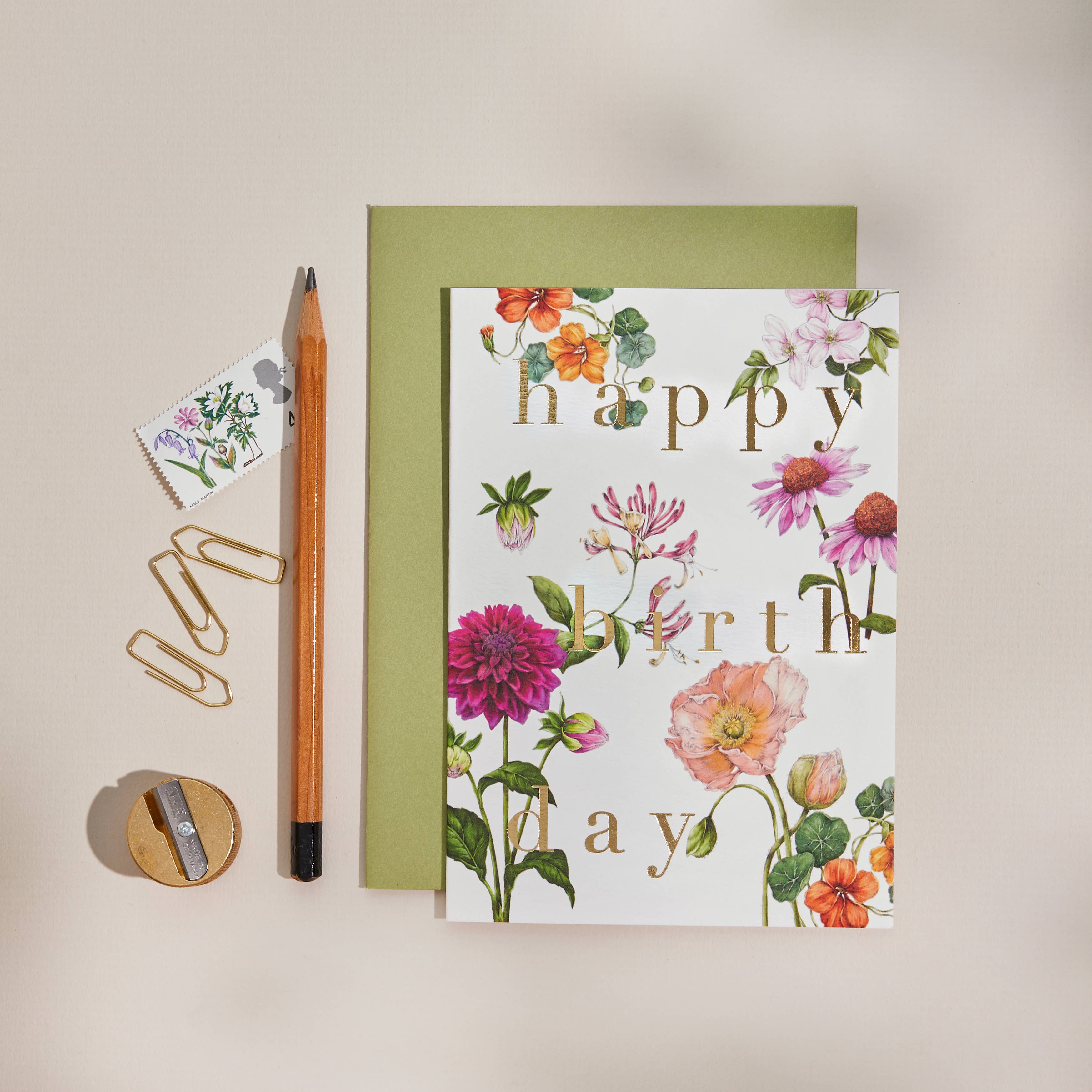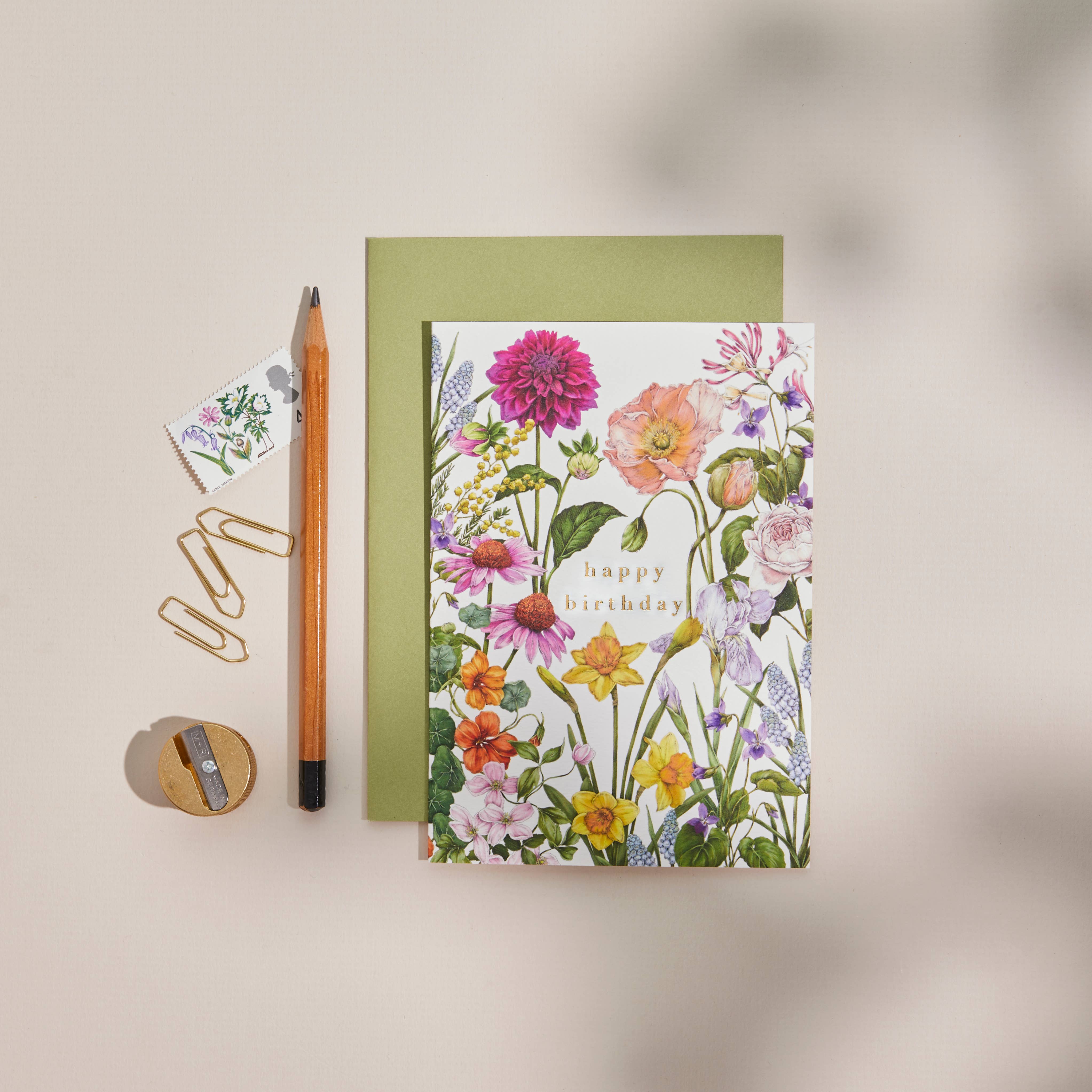 A6 Luxury Botanical Greeting Card with an Olive Green envelope. Blank on the inside. Printed in the UK on 300gsm FSC Certified textured stock and packed in a biodegradable bag. Luxury Gold foil wording. A6 - 5.8” x 4.2”