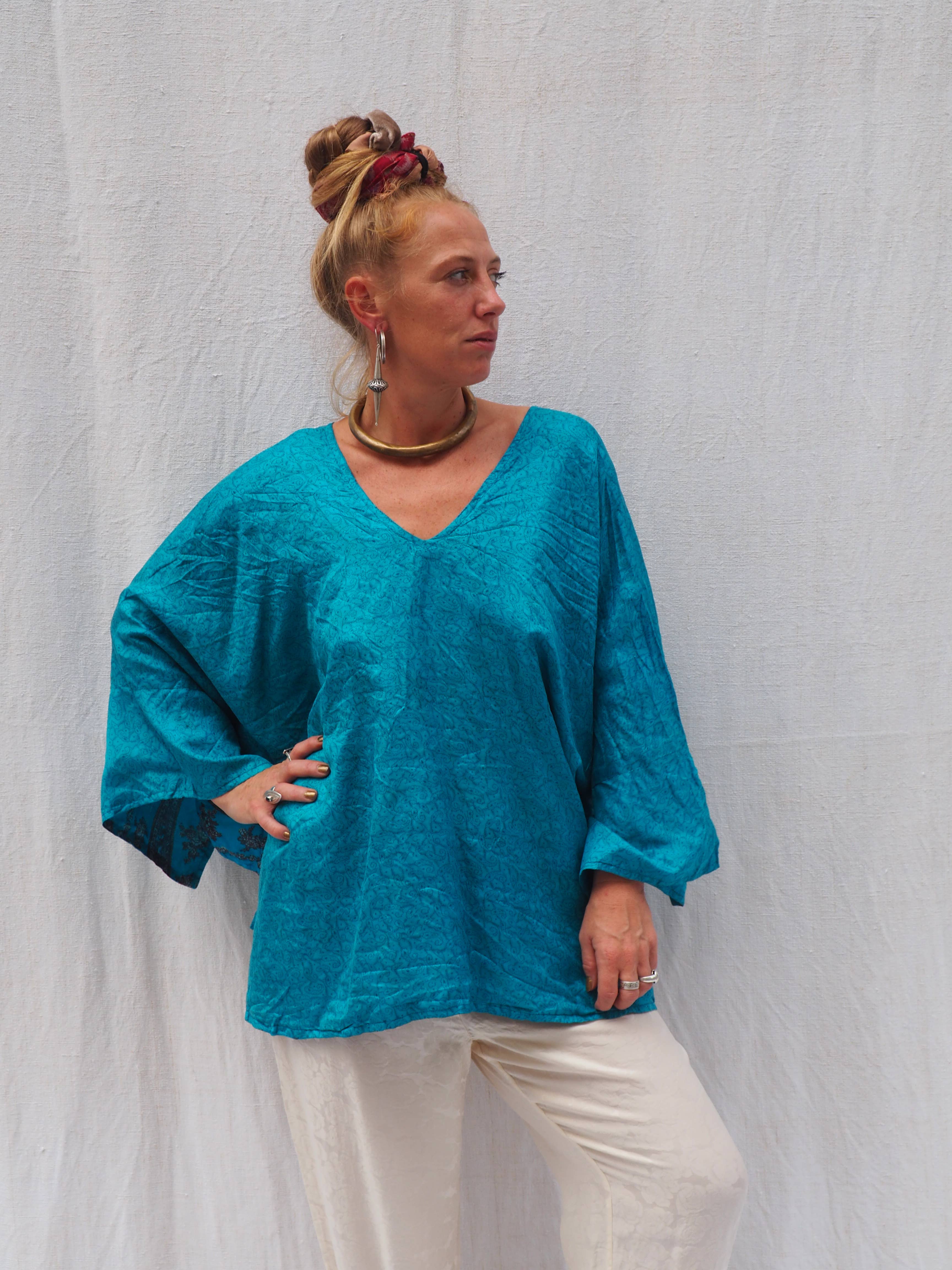 Made in India Aesthetic: Casual and Classic Care instructions: Hand wash Fit: Unisex Neckline: Collared Occasion: Everyday Season: Spring/Summer Sleeve length: Short-sleeve Fabric: Recycled Sari Fabric – A Story of Sustainability, Craftsmanship, and Cultural Heritage Our Recycled Sari Collection is crafted from up-cycled vintage Indian saris, each carrying a rich history, intricate craftsmanship, and a commitment to sustainability. These vibrant fabrics, once worn as traditional garments, are now given a second life in our designs, transforming into unique, one-of-a-kind fashion pieces with a timeless, bohemian elegance. What is Sari Fabric? A sari (or saree) is a traditional South Asian garment worn by women across India, Nepal, Bangladesh, and Sri Lanka. It is a long, flowing piece of fabric—typically 5 to 9 yards long—draped in various styles depending on region and culture. Saris have been worn for centuries and symbolise e heritage, grace, and femininity. The art of sari weaving is deeply rooted in Indian culture, with different regions specializing in specific weaving techniques, embroidery styles, and dyeing methods. These techniques create breathtaking patterns, luxurious textures, and vibrant colour combinations that make each piece truly special. The Materials: Silk, Cotton & High-Quality Synthetics Saris are made from a variety of high-quality fabrics, each with its own distinctive characteristics: Silk Saris – Known for their luxurious feel, soft drape, and intricate woven patterns. High-thread-count silk saris often feature metallic thread work, embroidery, and hand-dyed prints. Cotton Saris – Lightweight, breathable, and perfect for warm climates, often adorned with traditional block prints and natural dyes. Synthetic Blends – High-quality synthetic saris mimic the feel of satin, georgette, or chiffon, offering a soft and silky drape with beautiful fluidity. These are durable, wrinkle-resistant, and add to the versatility of the fabric. Each fabric has been carefully chosen for its rich texture, durability, and ability to be repurposed into stunning new garments. Up-cycling Saris: Giving New Life to Old Fabrics