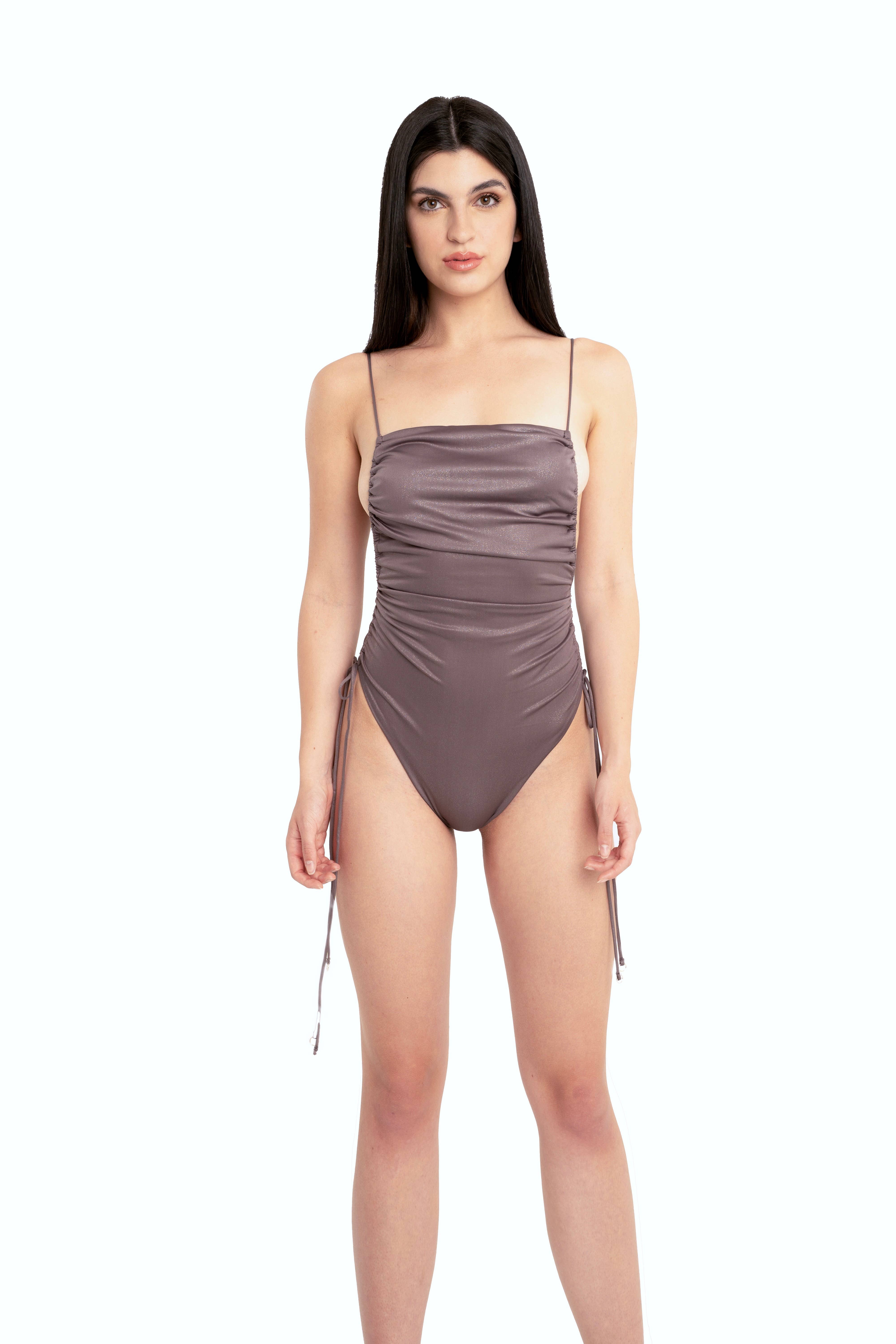 Costume due pezzi. Top fascia e slip brasiliano. Caratteristiche: fascia regolabile, slip con fibbia, colore shine. Composizione: 92% polyester 8% elastane 92% polyester 8% elastane TAGLIA S: 38-40 M: 40-42 L: 42-44