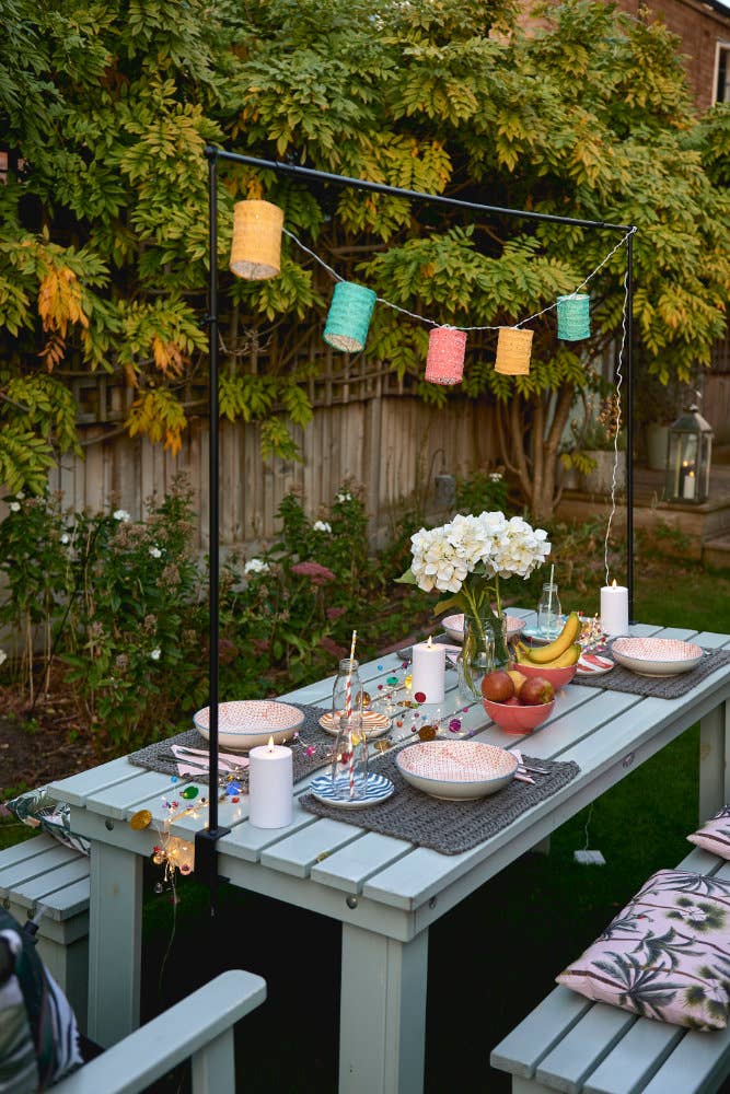 40 warm white LEDs Battery powered Requires 3 x AA batteries (not included) Approximate height: 80cm Lead wire length: 1m Material: metal / stone Built-in timer: 6 hours on, 18 hours off Indoor / Outdoor use