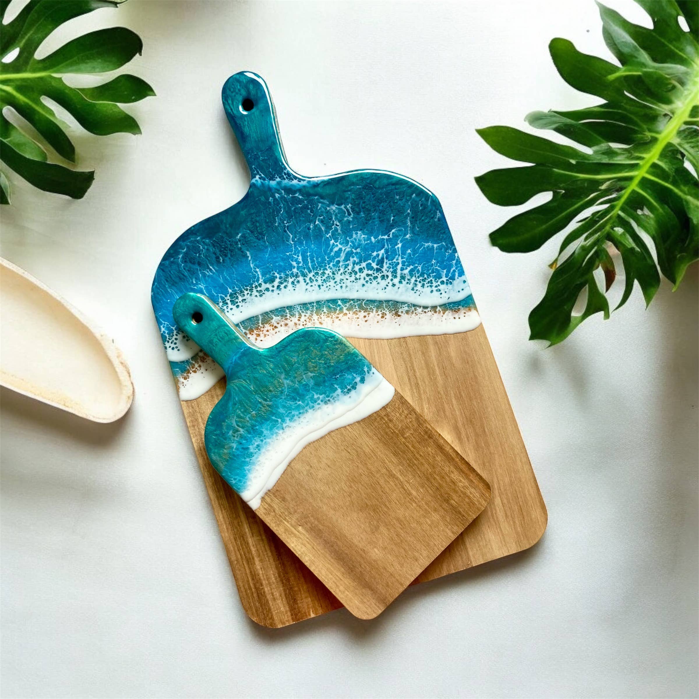 Large cheese/charcuterie board in maple wood. 21 1/2" x 8 3/4". NOTE: These pictures associated with the items are for representative purposes only. A similar item will be hand-crafted in the ocean color way. Your piece will all be one of a kind. Each original is created with decorative ArtResin which is food safe nontoxic. Although the resin is scratch resistant, marks will occur if enough pressure is used. It is recommended to cut and present food on the wooden part. These can be used everyday for cutting, special events as a cheese and charcuterie board and when not in use you can use it as a piece of your kitchen decor. CARE INSTRUCTIONS: Hand wash and polish with food safe oil on board. Stainless steel tray just use light soap and water. Use oil to maintain the wood every 4-5 weeks.