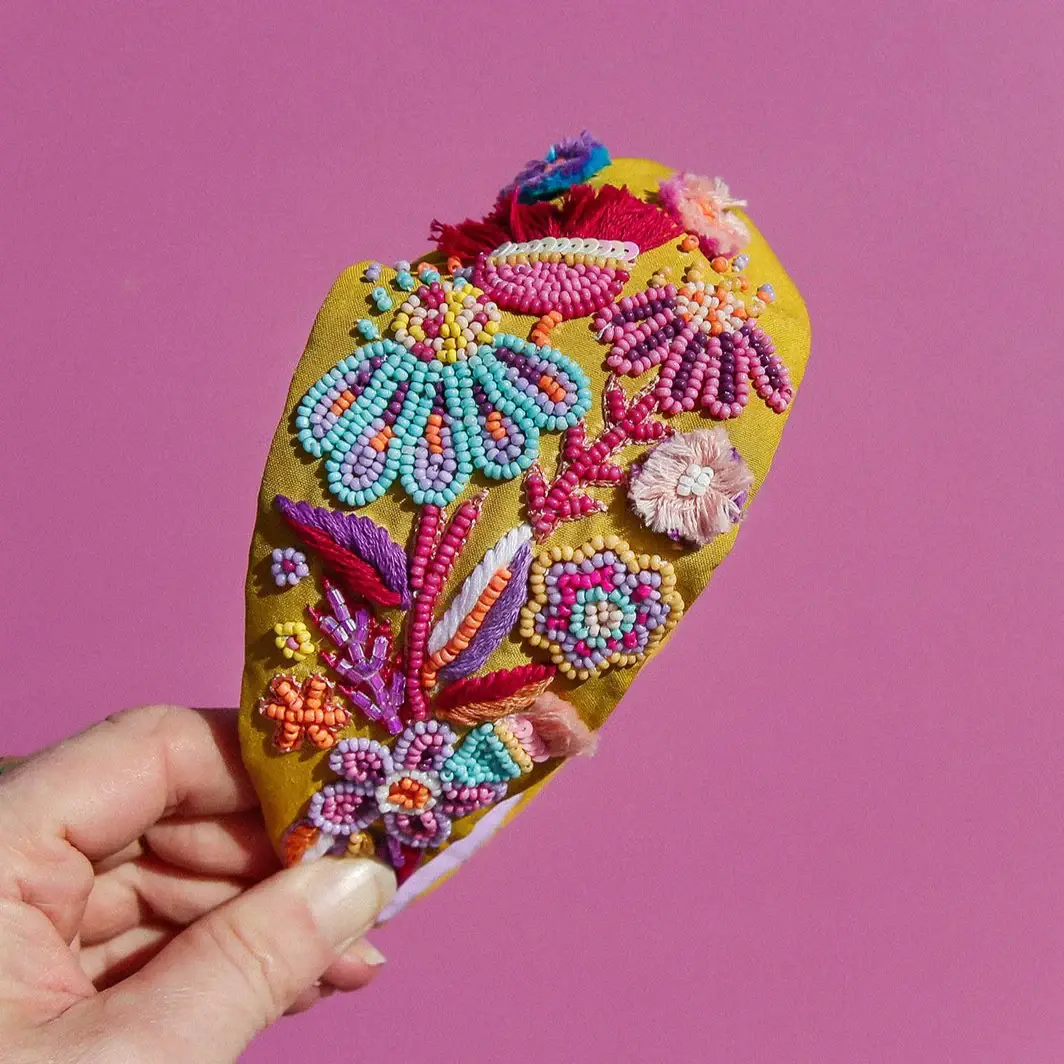 The Lobster Beaded Headband has been designed by Jemima Kingston in Australia. Exquisite detailing make this hand beaded headband a beautiful statement piece. The design is colourful, detailed and vibrant. Measurements: 13cm W x 14.5cm H 6.7cm (thickest part of side) The Henri is a flexible fit, providing more comfortable wear. It's a slightly heavier style due to the beading. This style is different to the silk headbands being shorter behind the ears. Designed in Australia by Jemima Kingston and hand crafted in India by Artisans.
