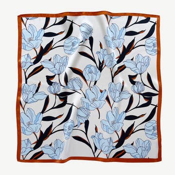 High quality and super soft silk scarf with beautiful vintage flowers in beautiful colors on neutral and beautiful white background. Spice up the wardrobe with this lovely scarf in 100% silk. The silk scarf is part of the new collection TREASURES Jim Lyngvild for Koustrup & Co. • 100% silk • 90x90 cm • Hand rolled edges • Withstands washbasin • Comes in beautiful gift box 300 g with box