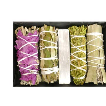 Palo Santo, Sandalwood, Rose, White Sage, & Lavender enhanced with Kyanite & Selenite.