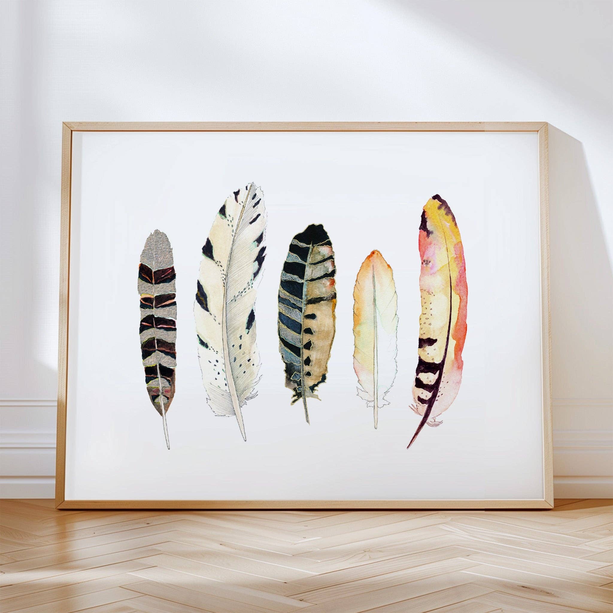 This is an archival fine art print of my original watercolor 5 Feathers No. 5 painting. Click here for the set of 4 feather prints seen in the 3rd photo. Each print is made with archival pigment-based ink on heavy 100% cotton paper that is sourced and made in the USA. We offer in-house framing using real, locally sourced oak wood or gold metal. All frames come with crystal-clear glass covers. Framed prints arrive at your door fully framed and ready to hang with all necessary hardware. Unframed prints are thoughtfully packaged with a firm backing board in a clear protective sleeve. Framed prints are carefully boxed with ample bubble wrap to protect the frame while on the shipping journey.