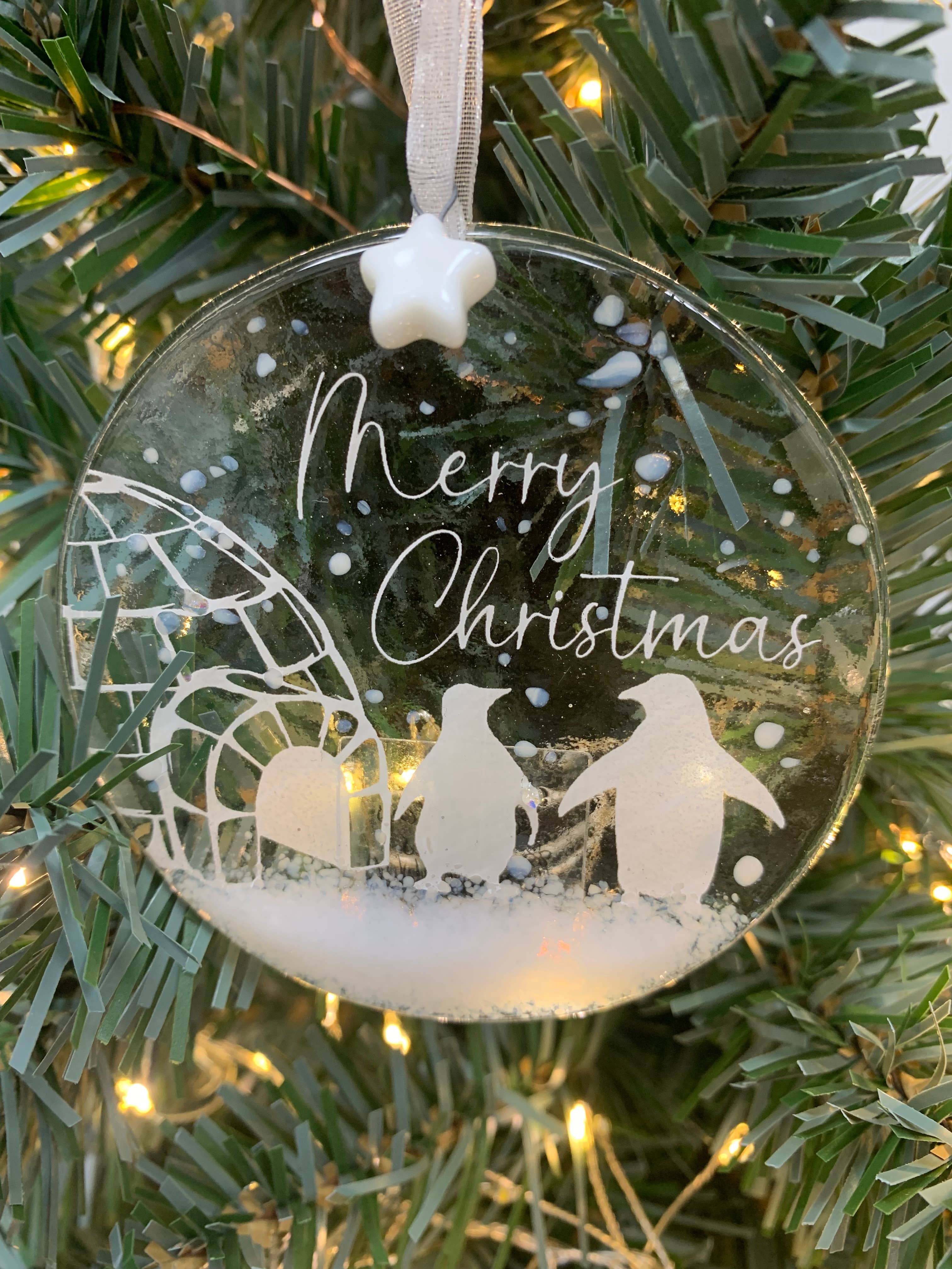 Handmade Fused Glass Polar Bear Christmas Tree Decoration With Ceramic Star Finish Bring a touch of winter wonder to your holiday collection with this handcrafted fused glass Christmas tree ornament, featuring a serene scene of a mum and cub polar bear strolling through snowy pine trees. Each piece is individually made, capturing the quiet beauty of the season and the warmth of family. Available in clear, red, teal, or blue glass, the ornament is finished with a delicate ceramic star and suspended by a sheer white ribbon—ready to hang and sparkle among the lights. The elegant “Merry Christmas” script adds a festive flourish, making it a perfect gift or keepsake. Handmade in small batches. Designed to enchant. Ideal for gift shops, winter displays, and customers seeking meaningful holiday décor.